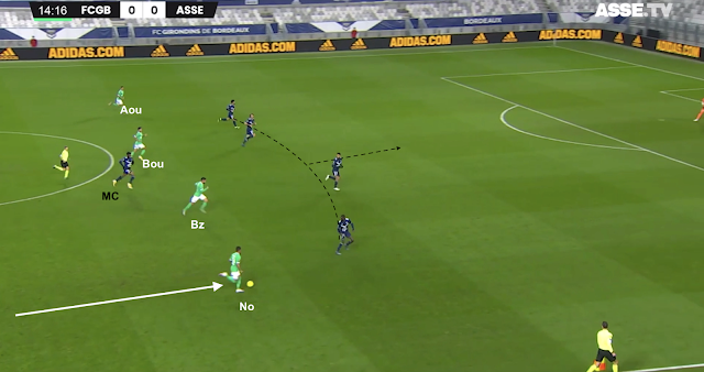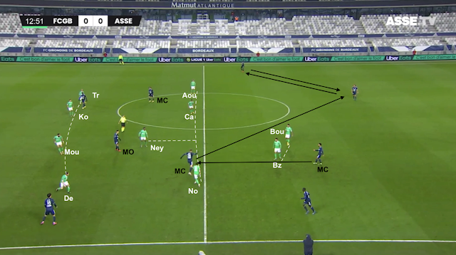 Bien positionnés, les Verts ont empêché les attaques adverses de se développer dans l'axe, là où le maître à jouer adverse se trouvait le plus souvent. Bordeaux s'est d'ailleurs montré dangereux en 1MT seulement quand celui-ci s'excentrait ou sur du jeu direct, pas construit. Quant aux contres, les Stéphanois ont eu plusieurs occasions, mais n'ont pas exploité quelques unes bien plus simples et dangereuses que celle dans cet exemple...