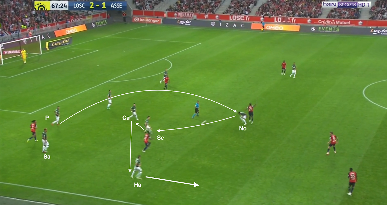 ... qui écarte avec Saliba dans le couloir droit. Sur cette image on peut voir la défense à 4 de l'ASSE et la nouvelle paire des milieux axiaux, Selnaes-Cabella. Saliba joue avec ce dernier...