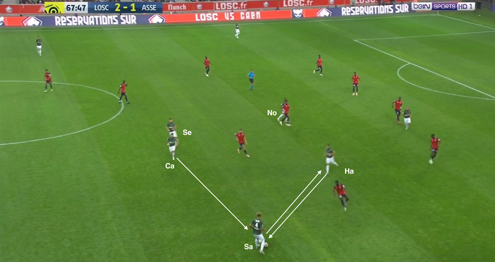 Toujours un 4-2-3-1 pour l'ASSE et de l'espace entre les deux lignes du LOSC - un milieu descend même de sa ligne pour être au marquage du "10" stéphanois, Perrin, Selnaes et Cabella combinent et le dernier joue avec Saliba à droite :
