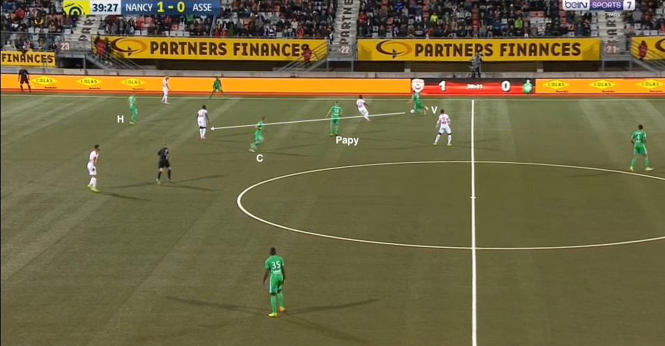 Entre temps, Hamouma n'a pas bougé. Deux secondes plus tard, le ballon tourne toujours via Lacroix, de nouveau vers la droite (Veretout) et encore une fois Lemoine :