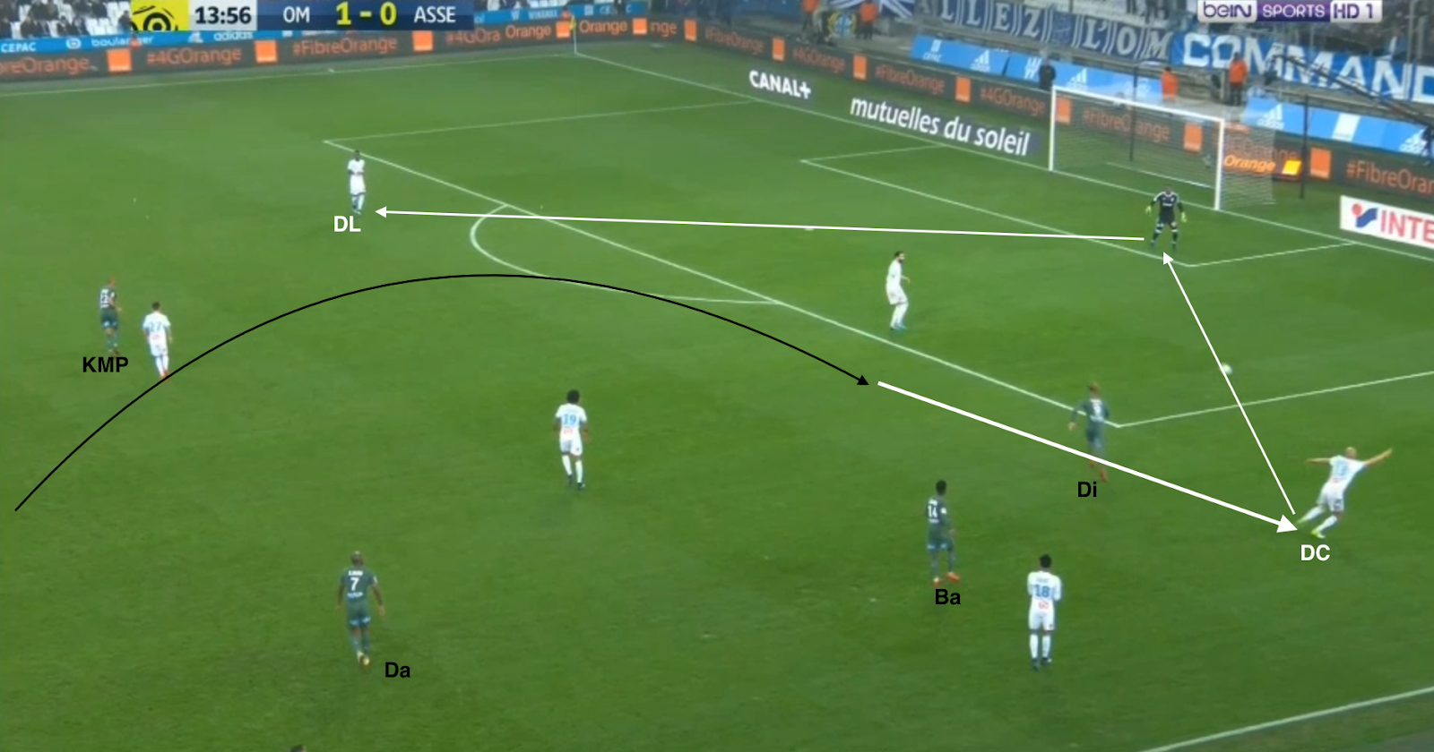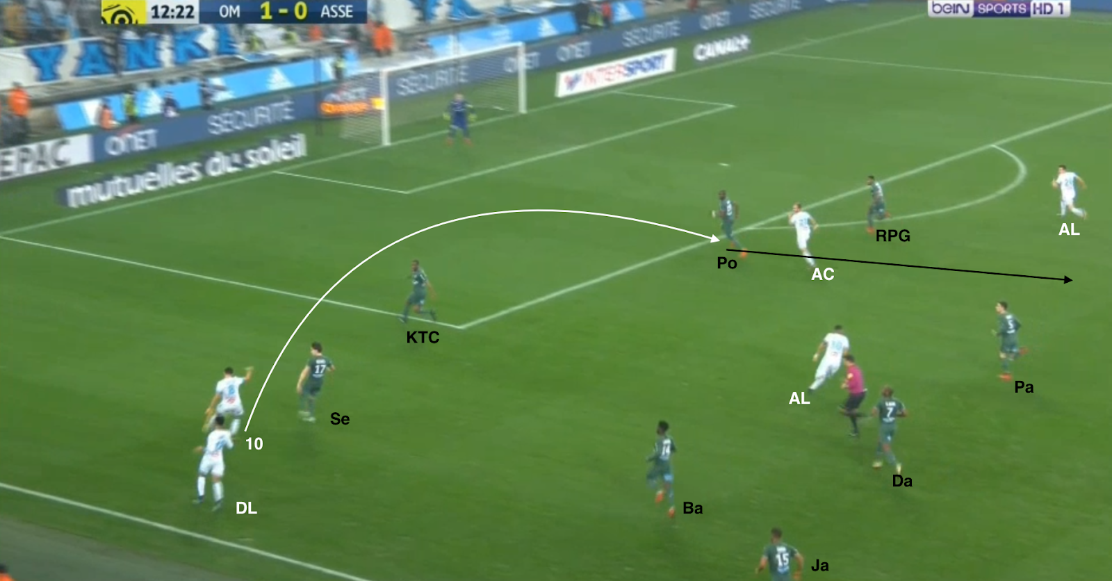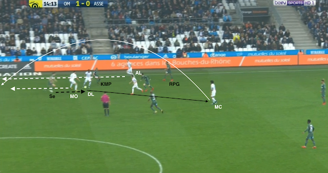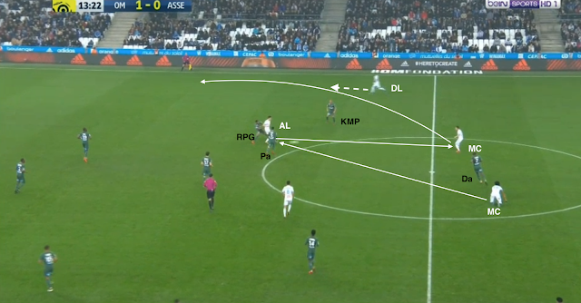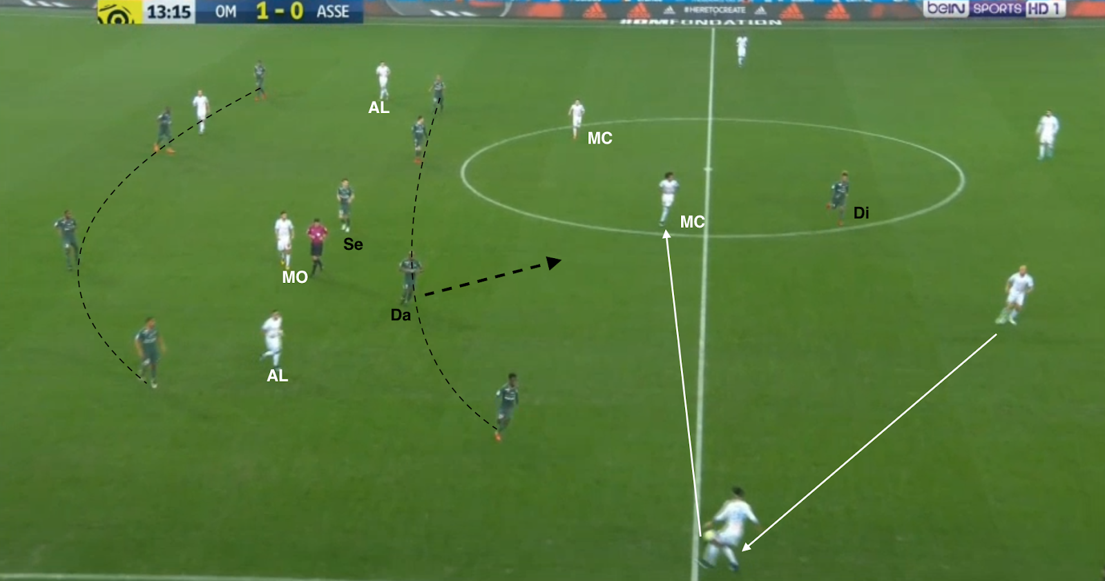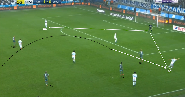 Les deux systèmes de jeu (4-1-4-1 vs 4-2-3-1) sont très explicites sur cette image - on peut aussi voir Dabo bien replié, sans faire de marquage individuel comme avant, et Diony qui ne peut pas couper les circuits de passe. Et l'attaque que l'OM a préparé tranquillement dans sa moitié est enfin déclenchée :