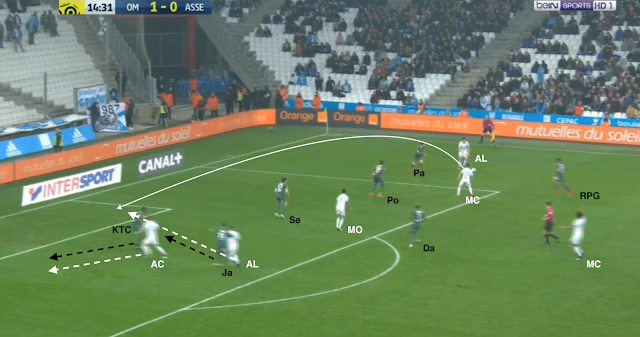 RPG est toujours loin, l'ailier de l'OM est pris par Pajot qui cherche à se rattraper. Chaque adversaire est surveillé par un Stéphanois, mais ça ne suffit pas. L'avant-centre fait un appel au 2e poteau (suivi par KTC), l'ailier fait l'appel complémentaire au premier (suivi avec un peu de retard par Janko). Il arrive ainsi à couper le centre et Ruffier réalise un magnifique arrêt sur la ligne, repoussant le ballon dans les pieds de l'avant-centre (hors-jeu)... pour faire un autre arrêt dans la foulée.