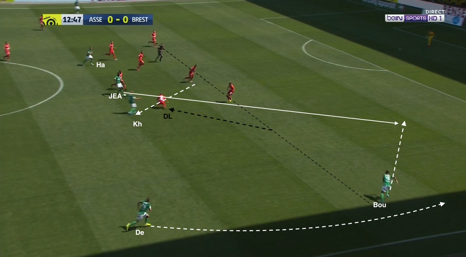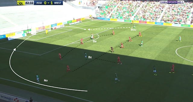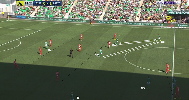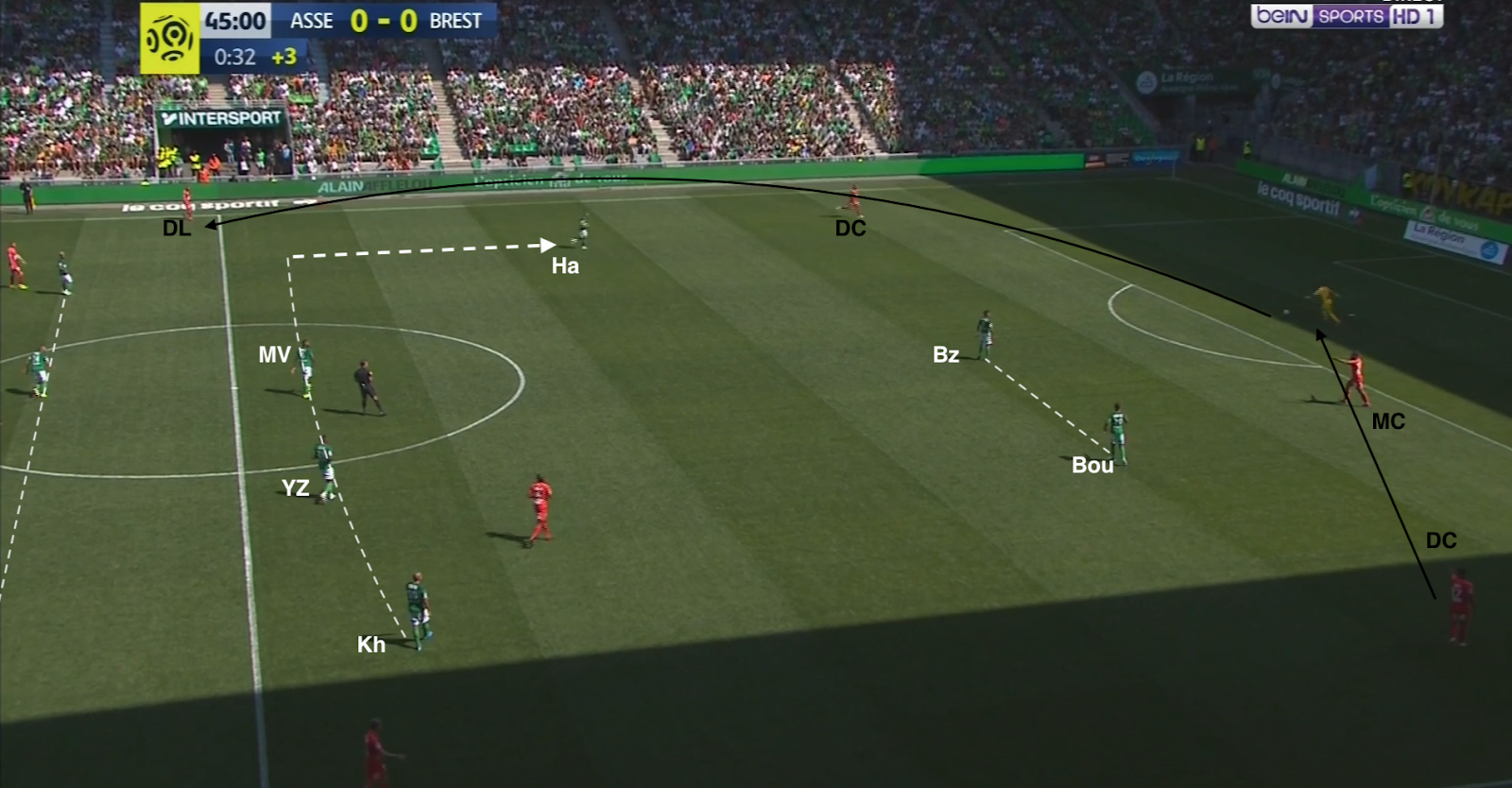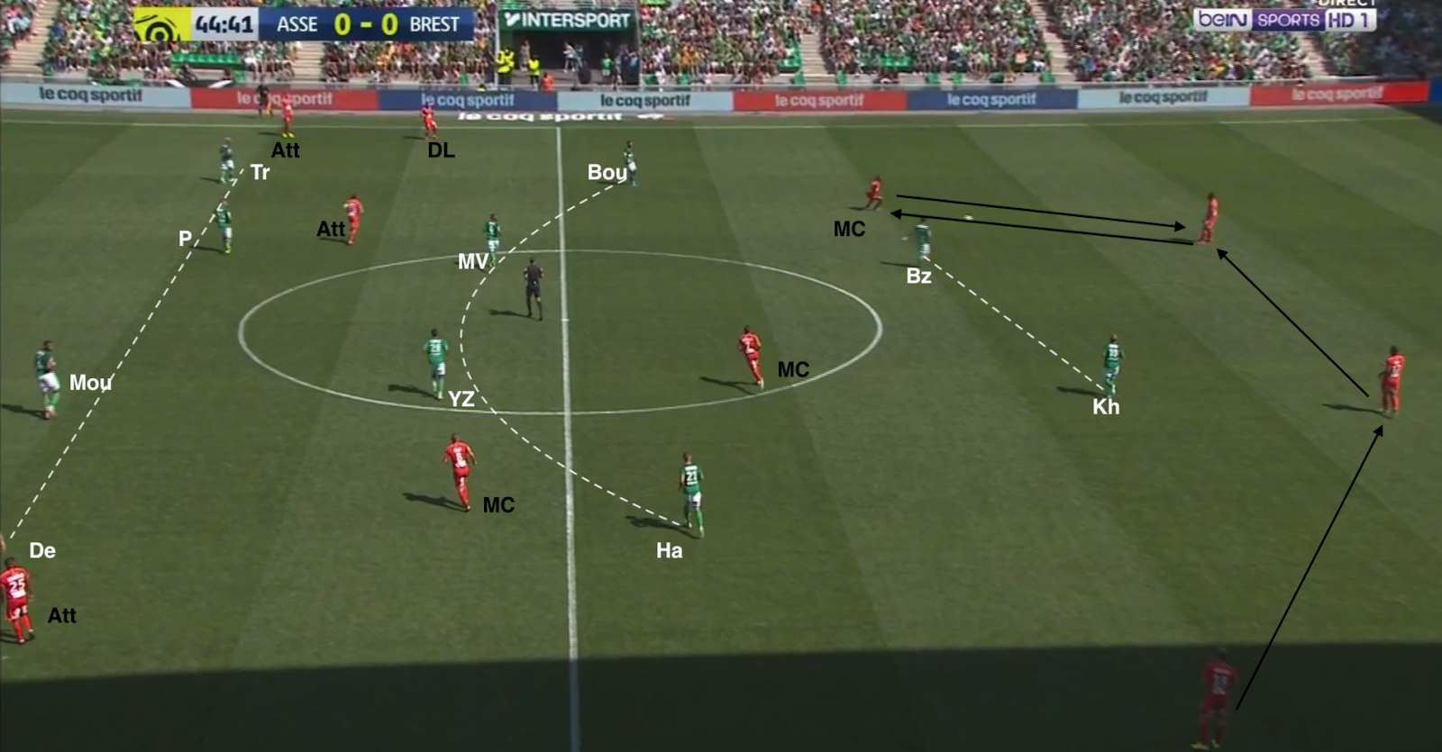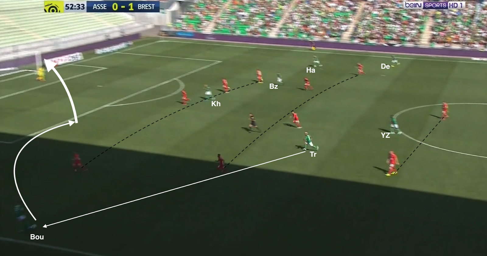 Ça part d'une attaque placée brestoise, le ballon circule en défense, le latéral droit est très haut et il y a un joueur derrière le premier rideau stéphanois. Quand ce milieu est recherché par une passe...