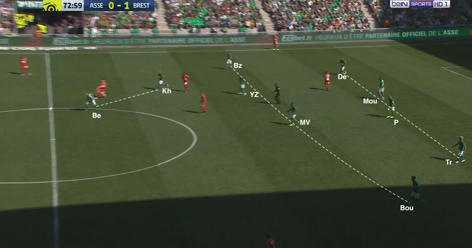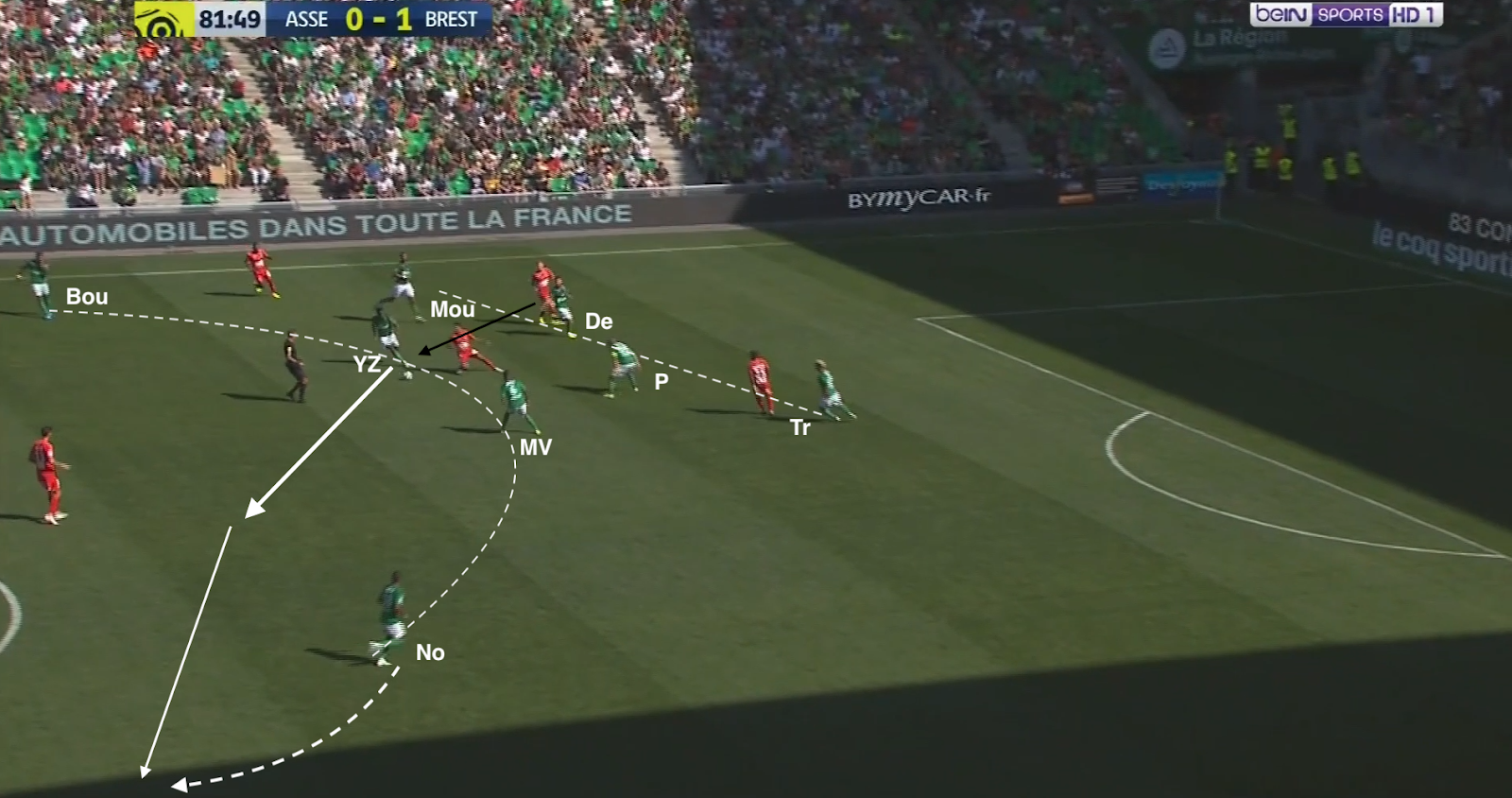 ... Youssouf se jette sur lui, quittant sa zone. Cet espace libéré profite à un autre milieu, qui est facilement trouvé et qui a le temps d'orienter le jeu vers la droite, où 3 de ses coéquipiers s'y trouvent. Mieux, il se projette ensuite dans le dos des milieux stéphanois...