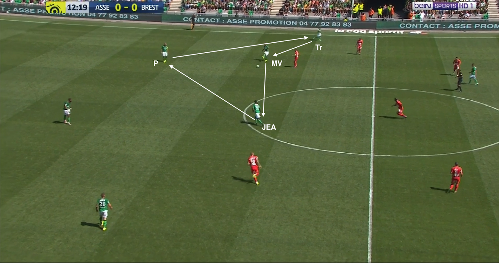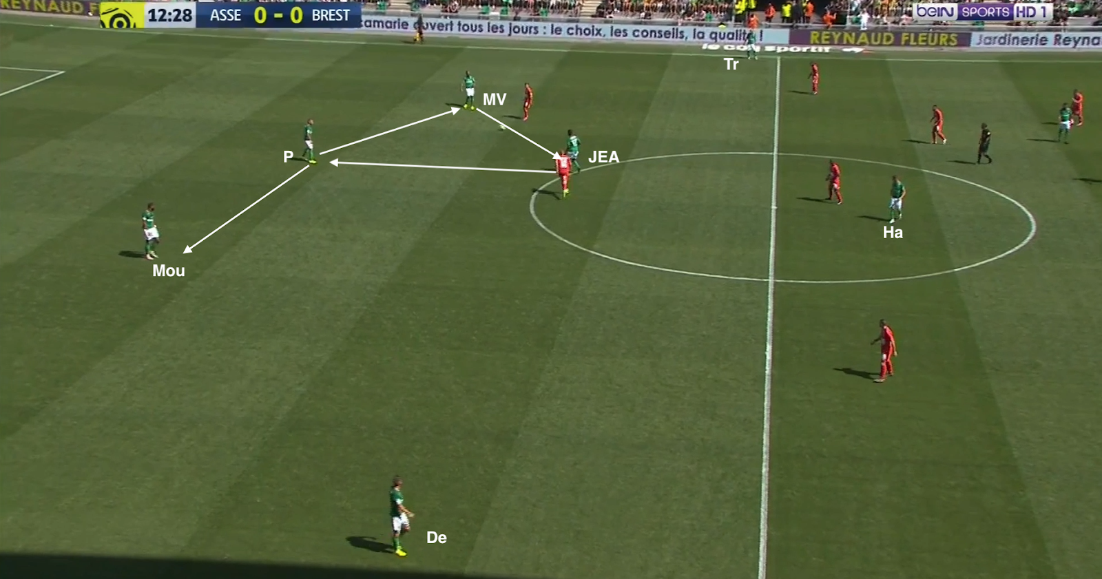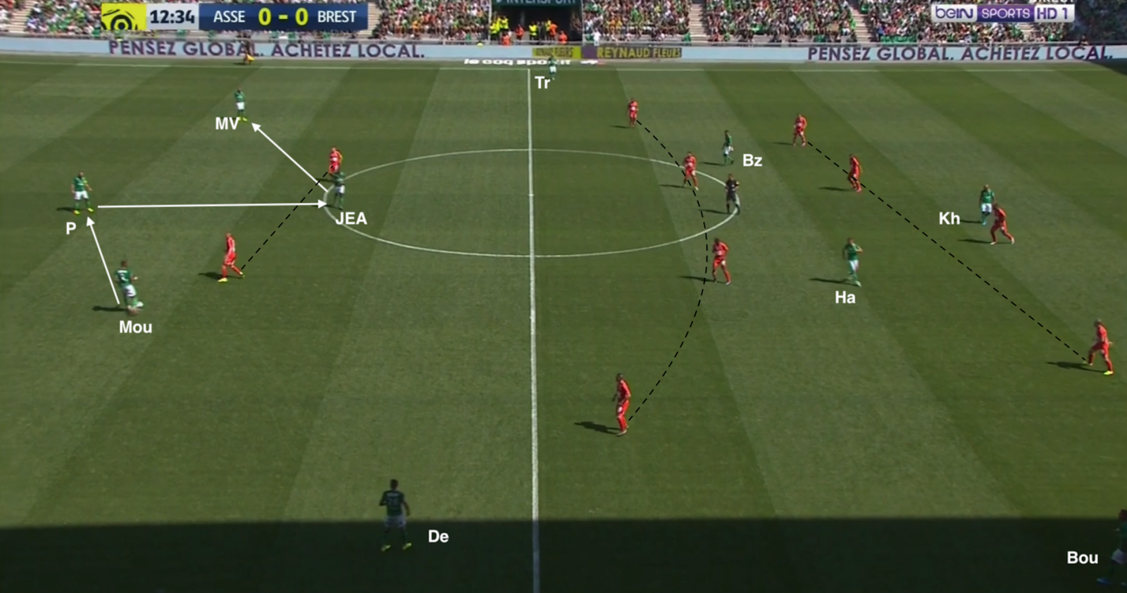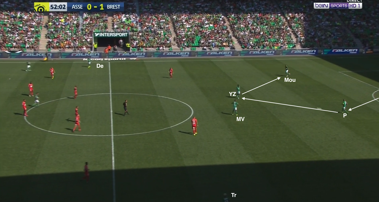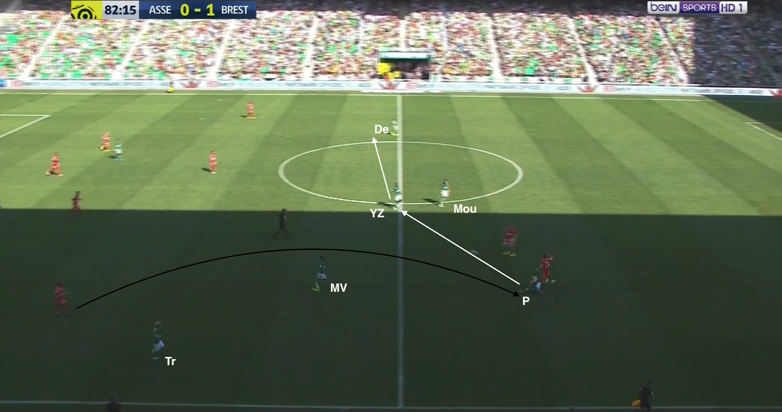 Le problème est résolu par les milieux de l'ASSE, qui sont facilement aspirés. D'abord Youssouf par un des milieux centraux, puis M'Vila par un autre :