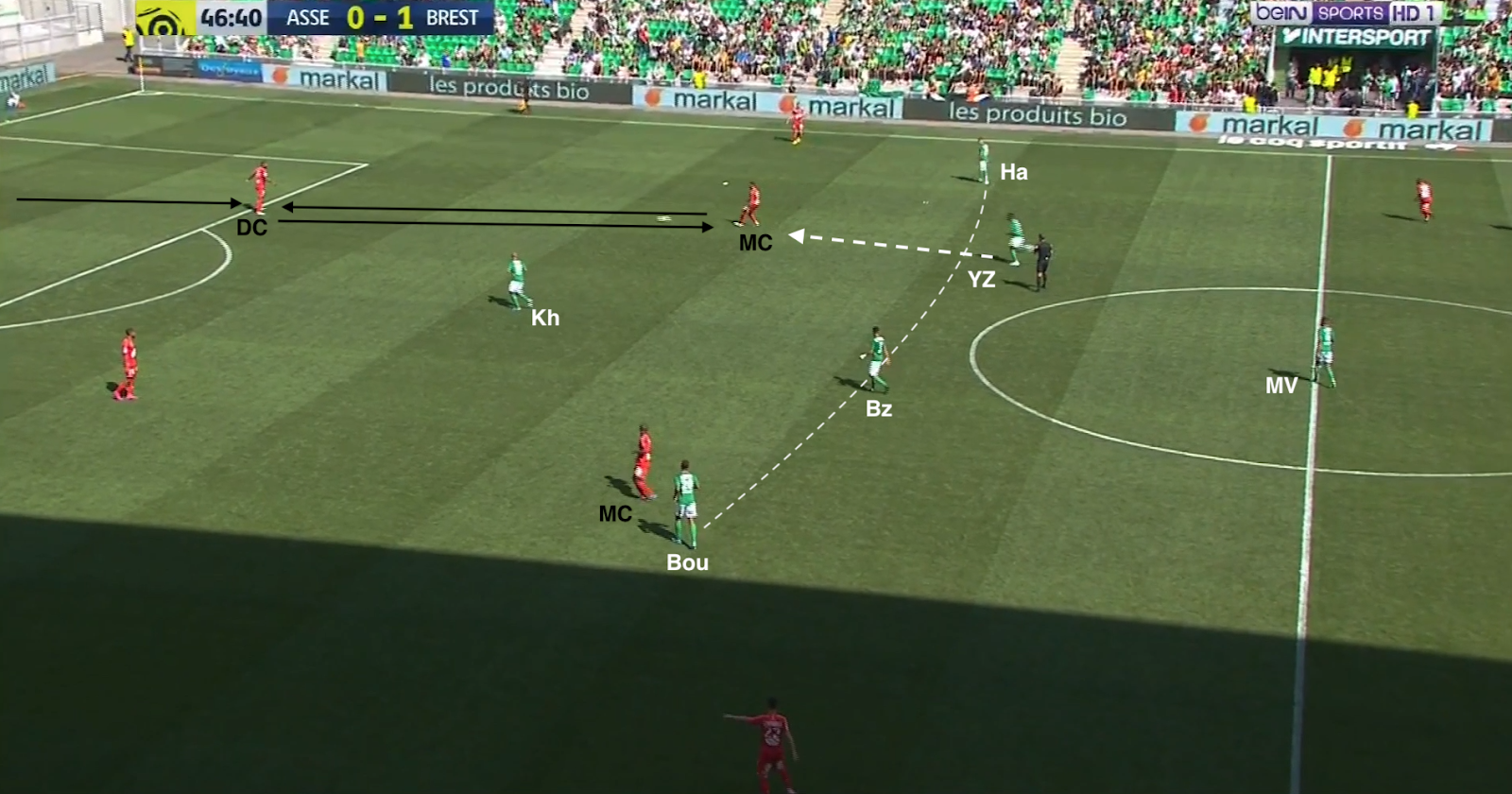 4 défenseurs pour 5 adversaires (il y a un ailier tout en bas de l'écran), des projections et deux passes vers l'avant transforment cette sortie non couverte d'Hamouma dans une véritable occasion pour Brest :