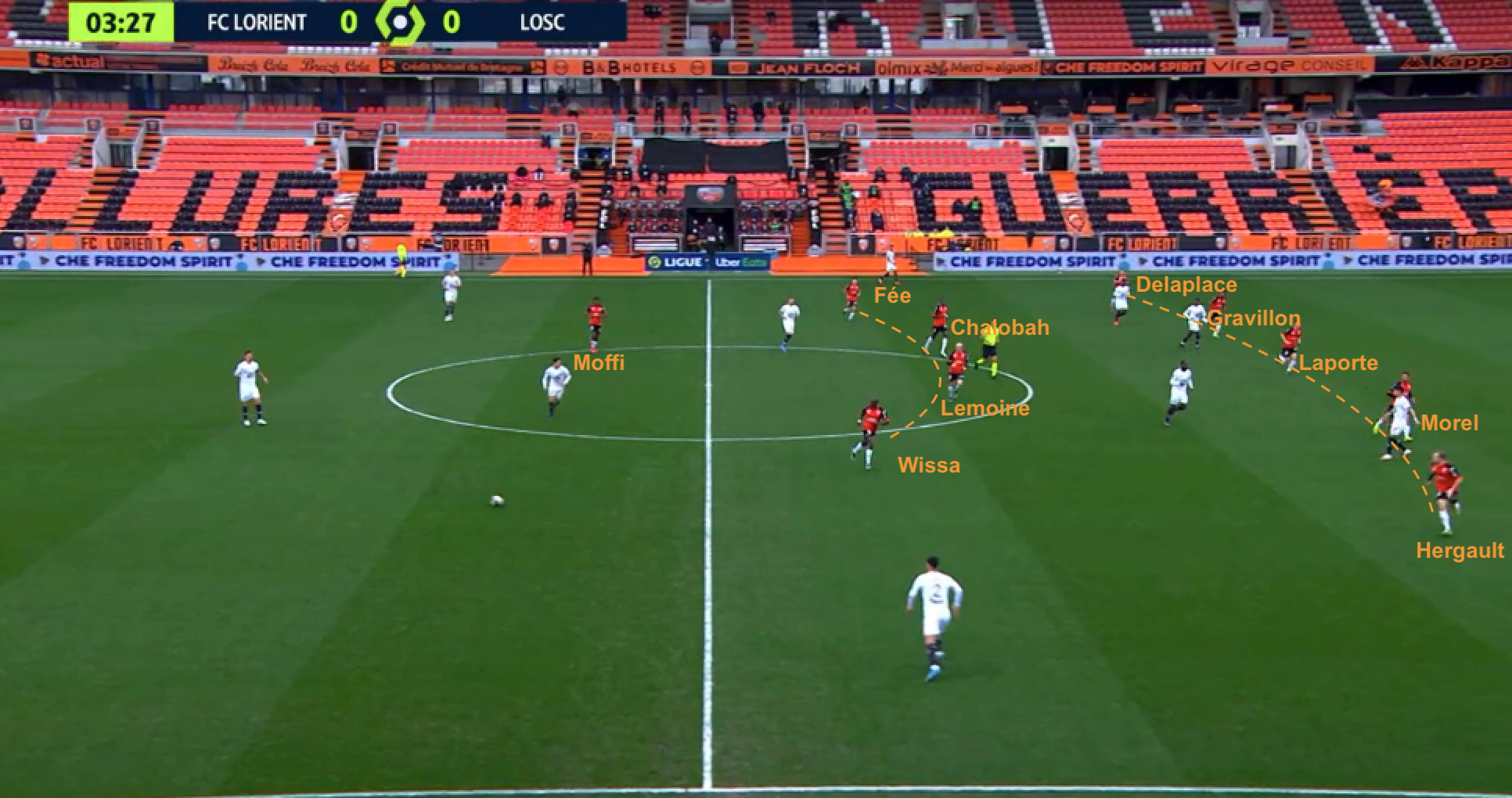 Les milieux de terrain représentent la clé du système défensif de Lorient. C'est là qu'on voit une vraie rotation mise en place d'un match à l'autre et ce sont eux qui sont le plus souvent remplacés en cours de jeu. Tout simplement parce qu'ils se dépensent beaucoup, ils font énormément de courses. En effet, les Merlus ne proposent pas un bloc bas et compact, les milieux sont très agressifs dans le bon sens du terme. Ils ne restent pas en place avec le but de couper les angles de passe vers l'avant, mais ils harcèlent sans cesse les milieux adverses d'un côté et d'autre de la ligne médiane. Ça gêne considérablement la construction du jeu, il faut une bonne maîtrise pour déjouer ce pressing.