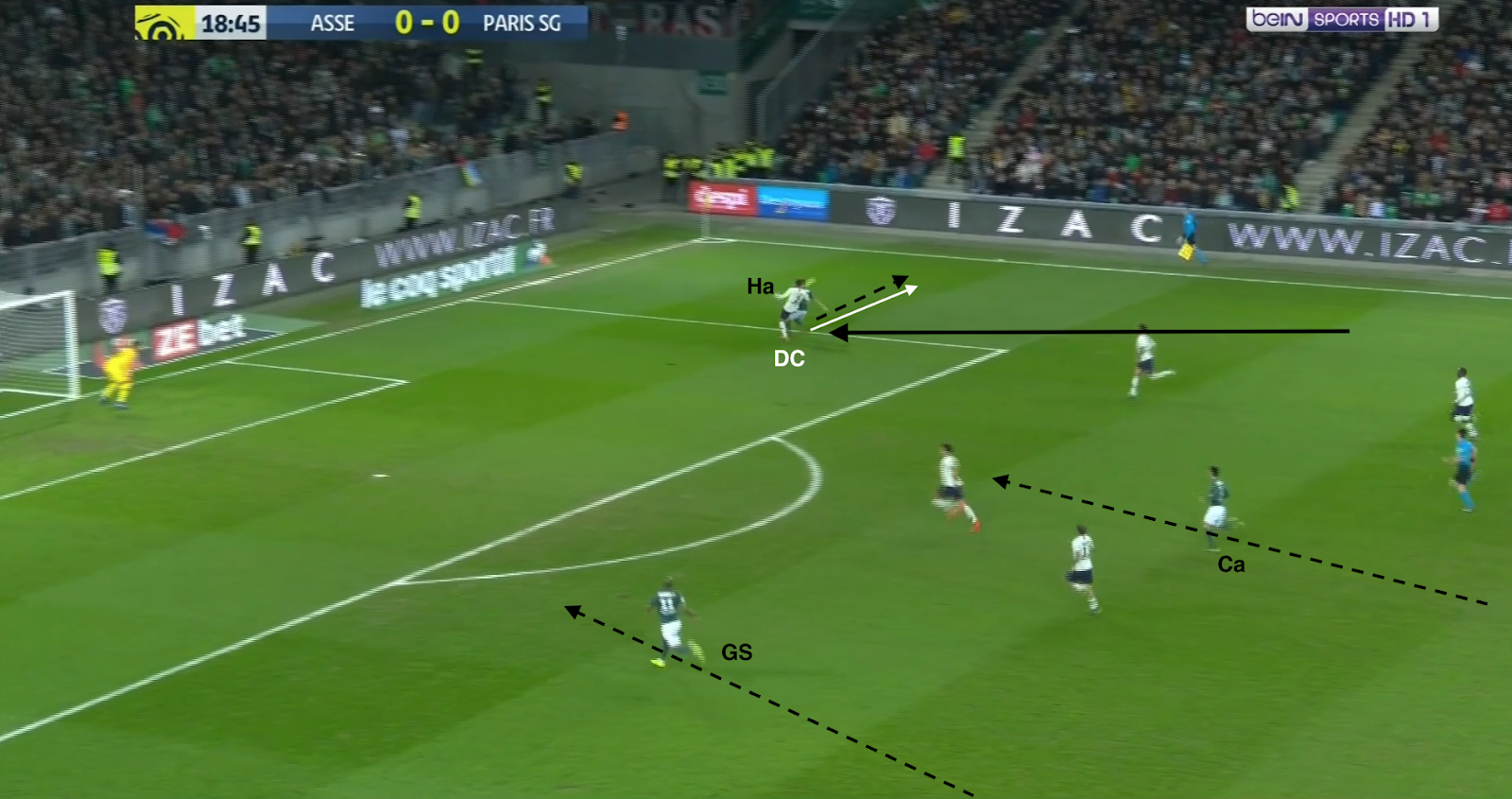 Les deux équipes ont démarré le match avec des défenses à 3, au 3-4-1-2 désormais habituel du côté de l'ASSE, le PSG ayant répondu avec un 3-5-2. Les systèmes étant symétriques et se neutralisant, la différence est faite par l'animation et l'approche tactique. Par exemple, une équipe peut choisir d'être en supériorité dans un couloir et de construire ses attaques à partir de là, pendant qu'une autre peut décider de subir et jouer vite les contres. Comme dans cette action qui commence à la 19e avec une relance de Ruffier pour Debuchy :