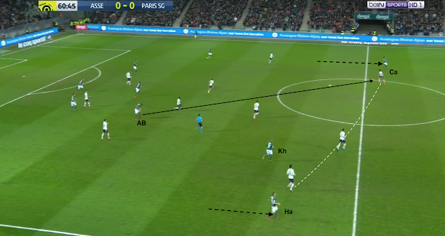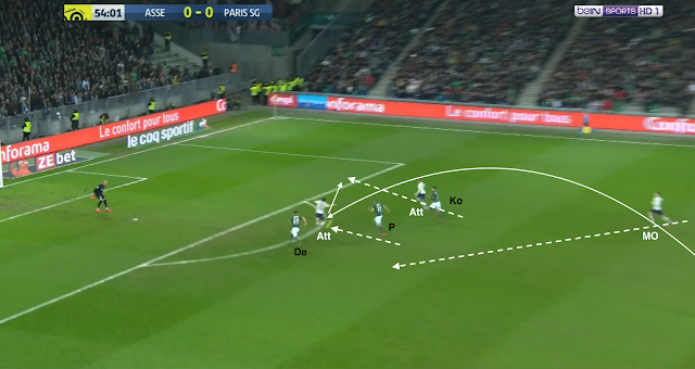 Le choix stéphanois a clairement été de défendre bas, avec un bloc très compact, dense dans l'axe. Même si un 0-0 aurait satisfait les Verts, ils ont aussi envisagé de se montrer dangereux en contre, comme dans cet exemple qui commence à la 61e avec une attaque parisienne :