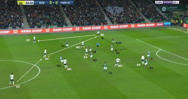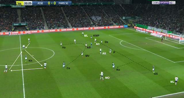 ... et on aperçoit une équipe du PSG coupée en deux. Quatre font un toro avec Khazri dans le rond central, cinq sont pris par les cinq défenseurs de l'ASSE et celui qui devrait relayer le ballon entre eux est pris entre les milieux stéphanois. Les défenseurs parisiens décident d'amener du surnombre en montant plus haut :