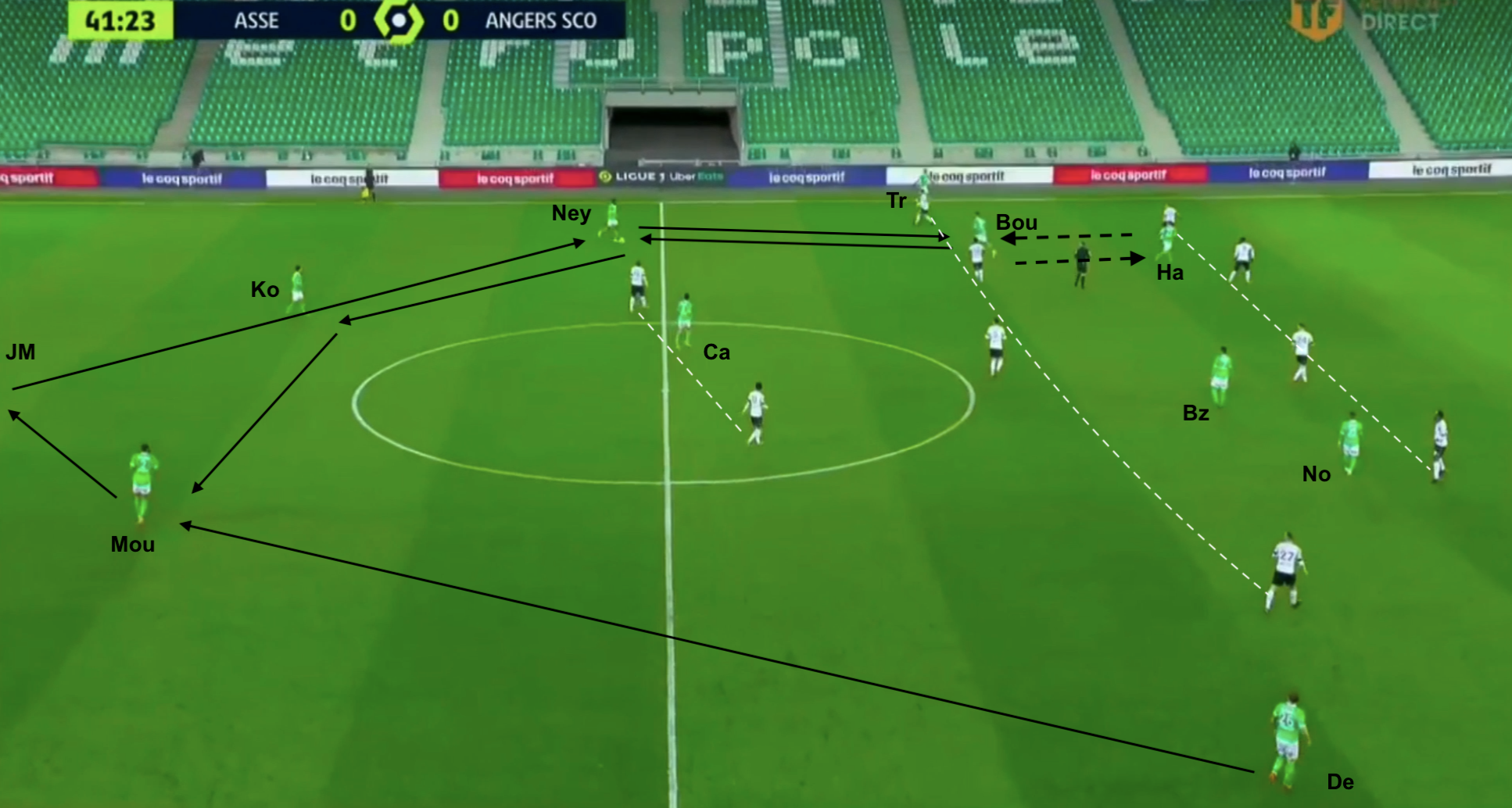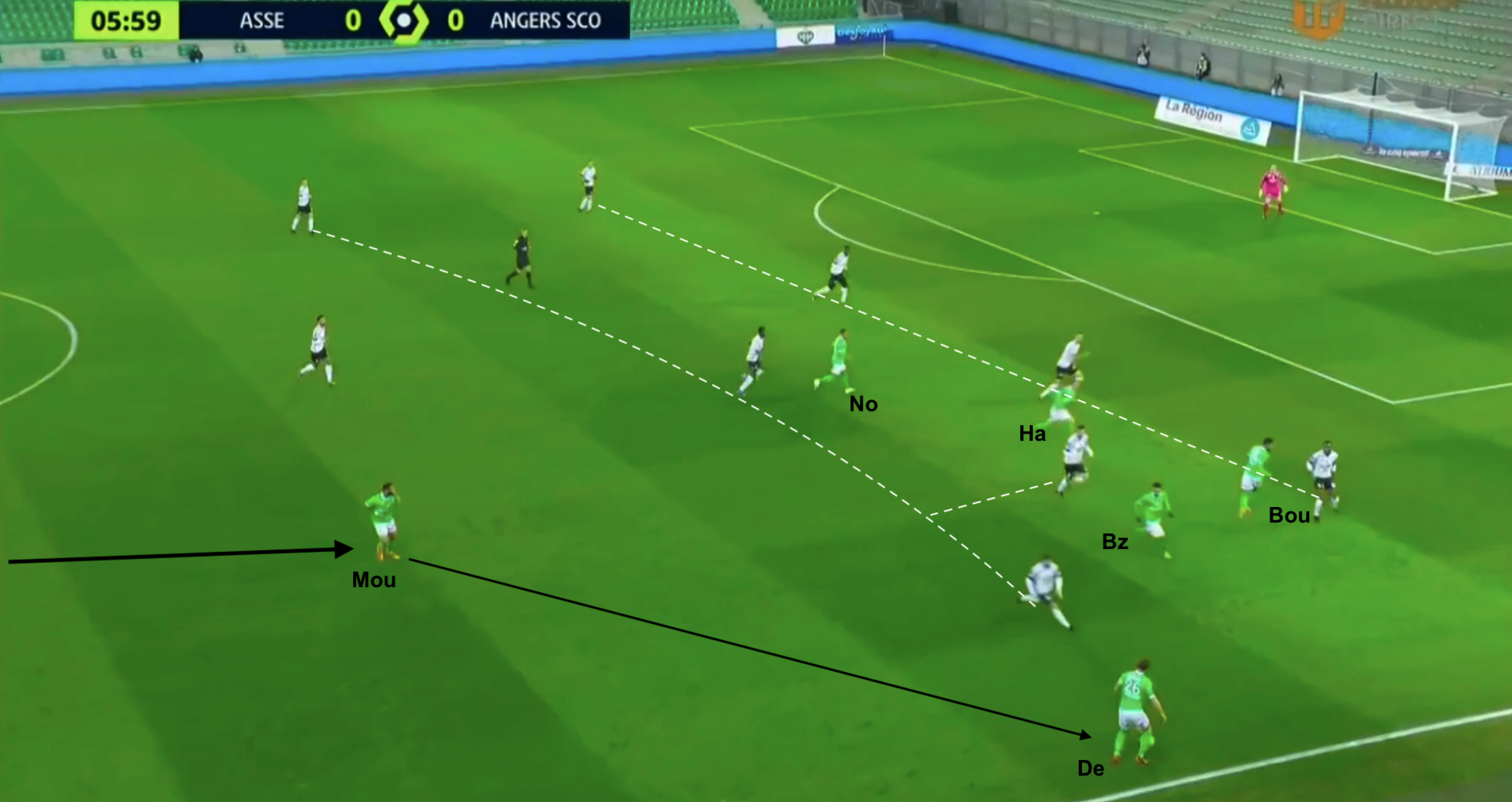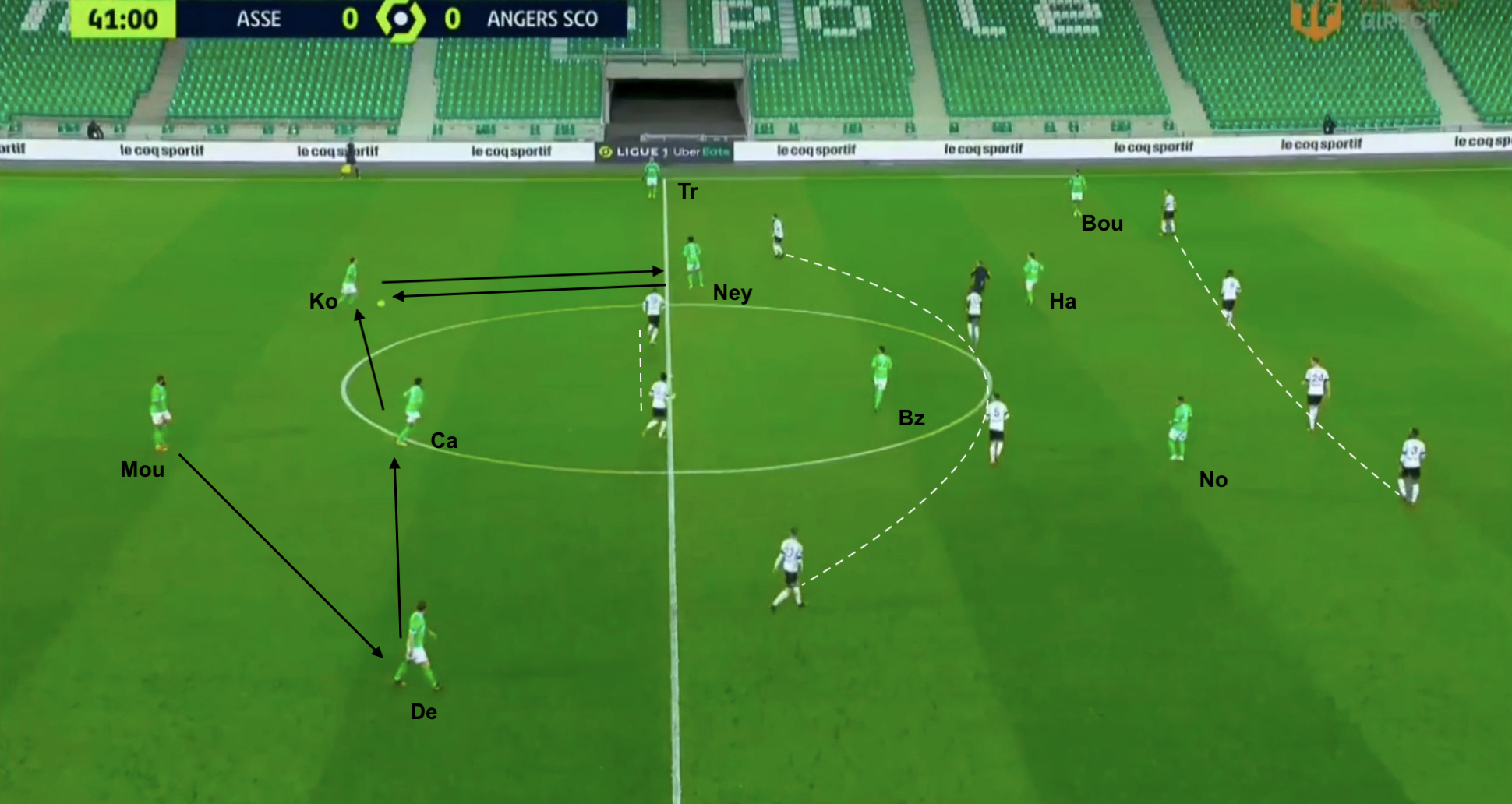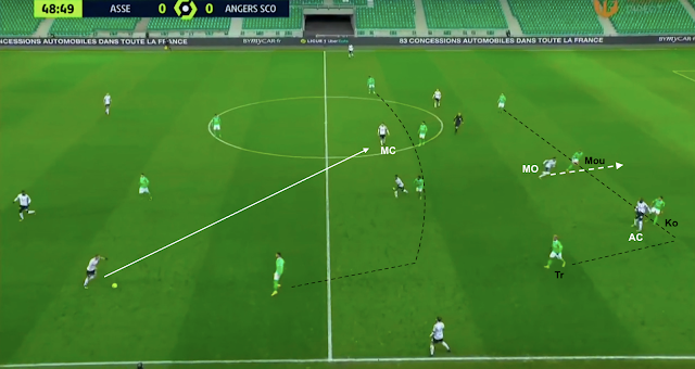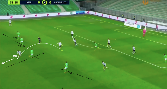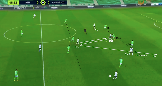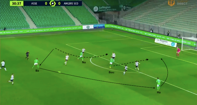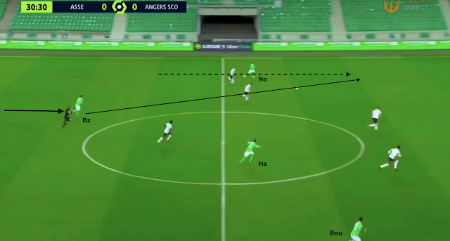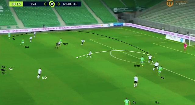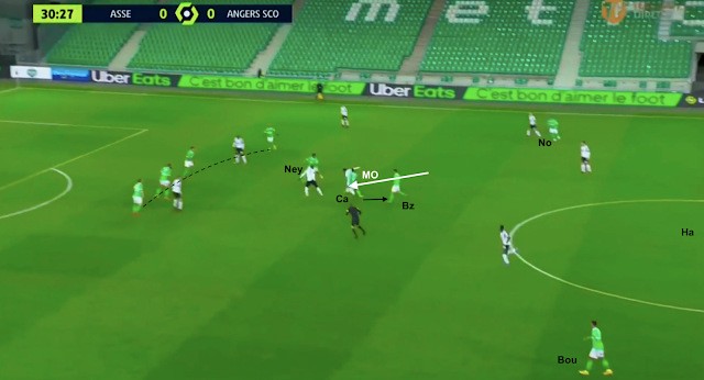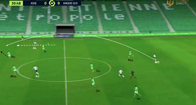 Dans l'exemple précédent de l'attaque angevine on a vu un milieu axial se projeter pour profiter de l'espace créé, pendant que dans les deux exemples d'attaques stéphanoises il n'y avait ni Neyou ni Camara sur l'image quand Debuchy reçoit le ballon. En 1MT, ce manque d'apport offensif des deux milieux a été assez évident, comme par exemple à la 31e :