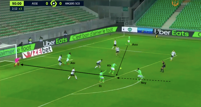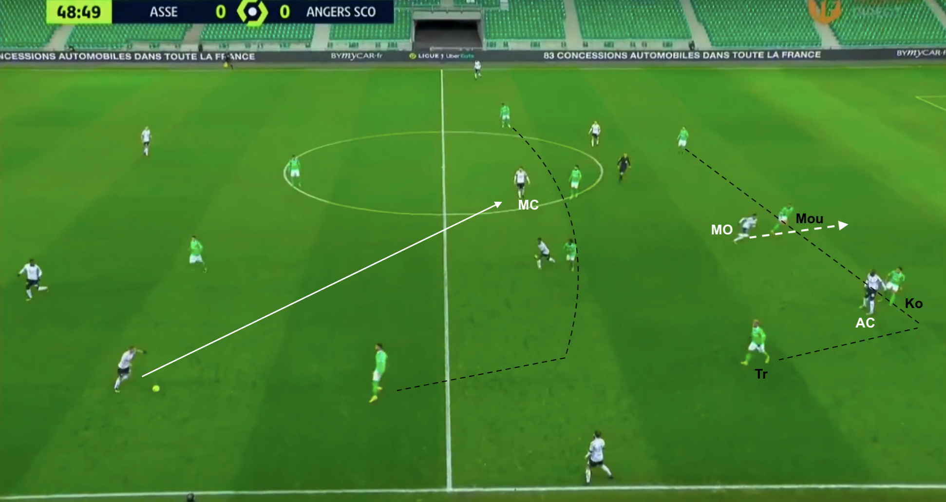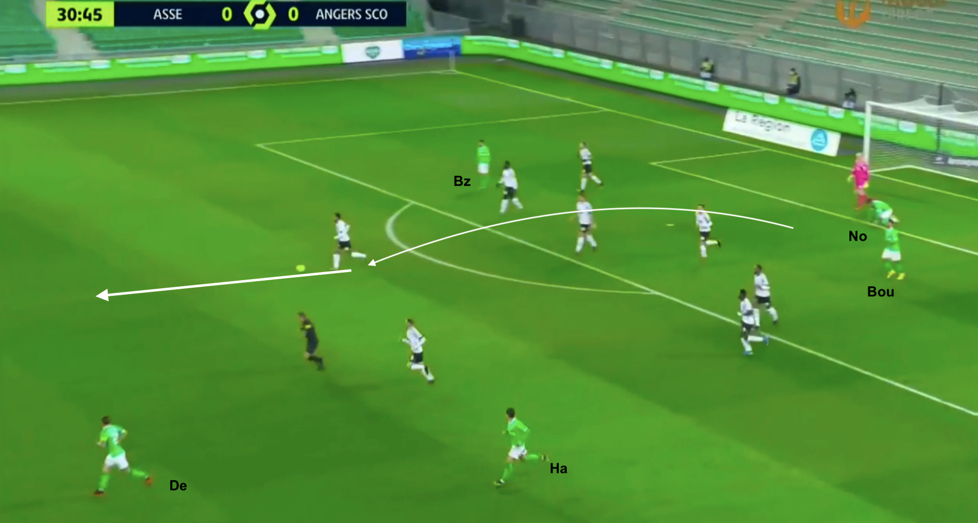 Comme Bouanga était monté sur le latéral droit, Trauco est sorti de sa ligne pour surveiller l'ailier. Il y a une combinaison entre les lignes stéphanoises - chose que les Verts n'ont jamais pu faire dans le bloc angevin - et ensuite l'avant-centre est lancé dans le dos de Trauco. Du jeu très simple, mais efficace dans la création des situations offensives potentiellement dangereuses. Heureusement, le centre est repoussé par la défense.