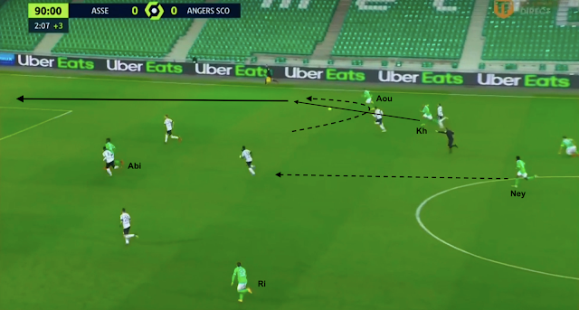 C'est difficile de faire le jeu contre un bloc serré et bien en place. Il faut une grande qualité technique pour jouer à l'intérieur du bloc, ou le contourner, ou bien il faut créer ces espaces grâce à des déplacements intelligents sans ballon. Les Verts ont opté pour la deuxième solution, comme on peut le voir dans cette attaque à la 42e minute :