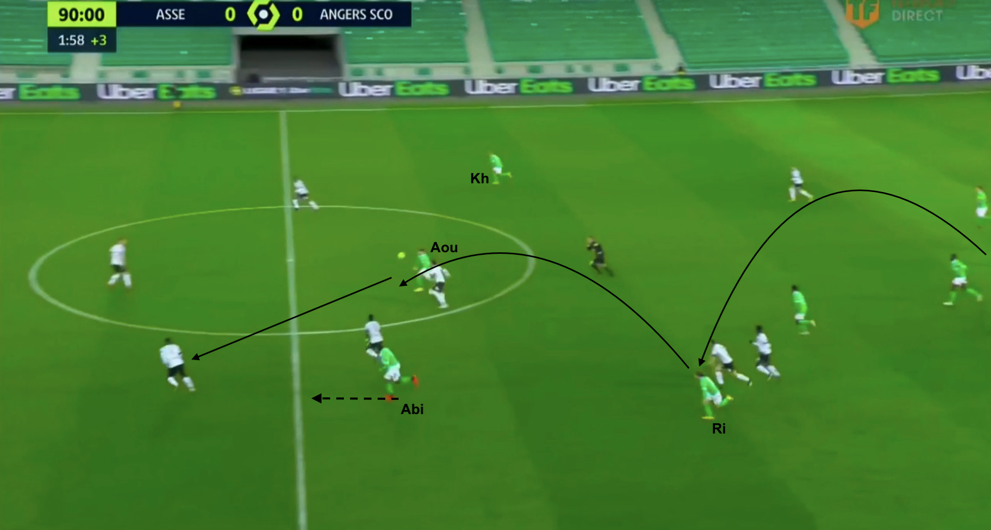Suite à une touche angevine, il y a eu plusieurs changements de possession dans la moitié stéphanoise. Un milieu du SCO essaie de percer balle au pied, mais Camara lui enlève le ballon, qui arrive à Boudebouz. Le contre des Verts peut démarrer :
