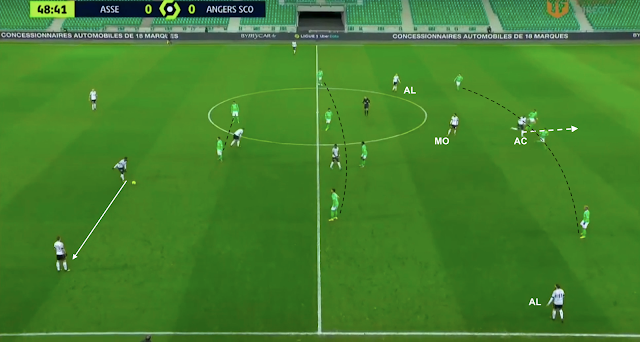 En effet, il y a une certaine continuité depuis la déroute à Brest et même si les Stéphanois n'ont pas marqué lors de leurs deux derniers matchs, ils n'en encaissent pas non plus. Et contre Angers il y a eu du bon, même s'il reste encore plein de choses à améliorer au niveau de l'animation offensive, comme on peut le voir dans quelques exemples.