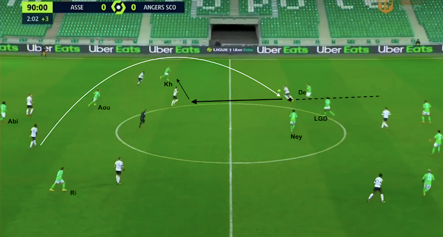 ... où il n'y a aucun autre Stéphanois. Neyou et Camara n'ont pas du tout accompagné leurs attaquants dans ce contre, le seul autre Vert qui l'a fait était Debuchy. Le milieu angevin peut donc ressortir tranquillement et profiter des espaces :
