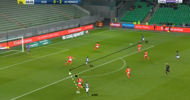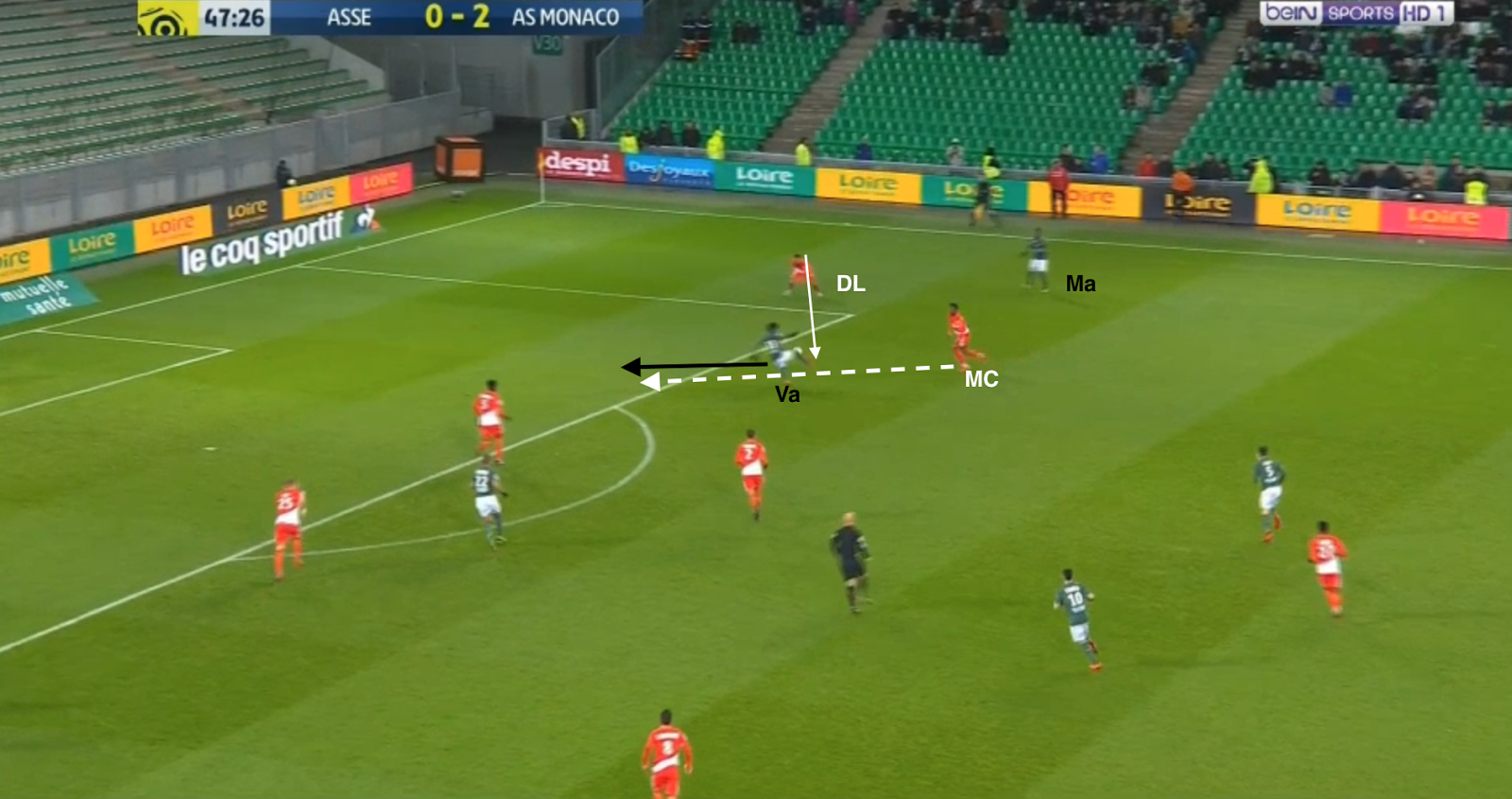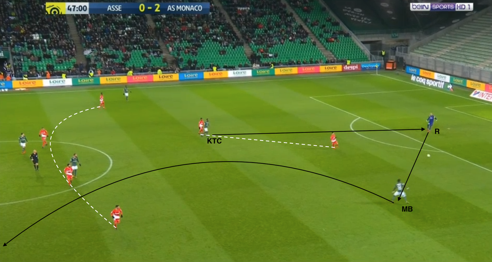 ... qui change de côté via MBengue jusqu'à Gabriel Silva. Sur cette image on remarque que Monaco est passé dans un 4-1-4-1, avec un milieu axial entre les lignes, au marquage de Cabella. Silva redonne le ballon à Hernani...