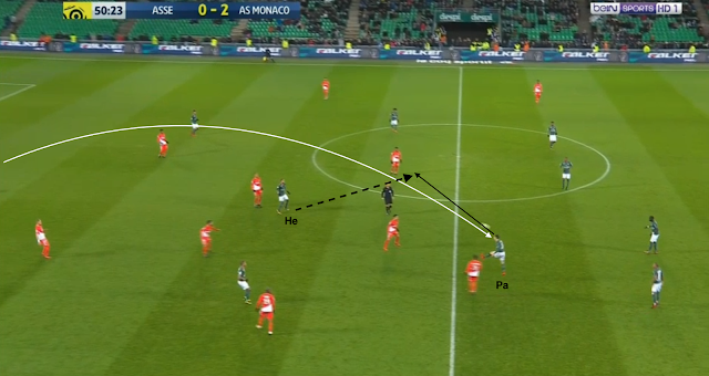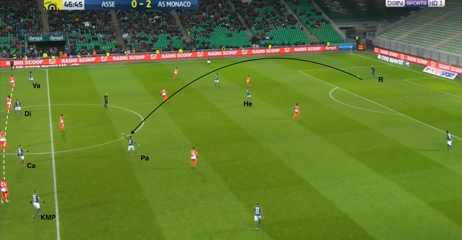 Sur cette image on remarque le (4-)4-2 Monégasque et le 4-3-(3) Stéphanois, avec un Hernani pointe basse qui demande le ballon, sans être servi. C'est Pajot qui est recherché par son gardien, il gagne son duel de la tête, mais un défenseur adverse dégage en touche.