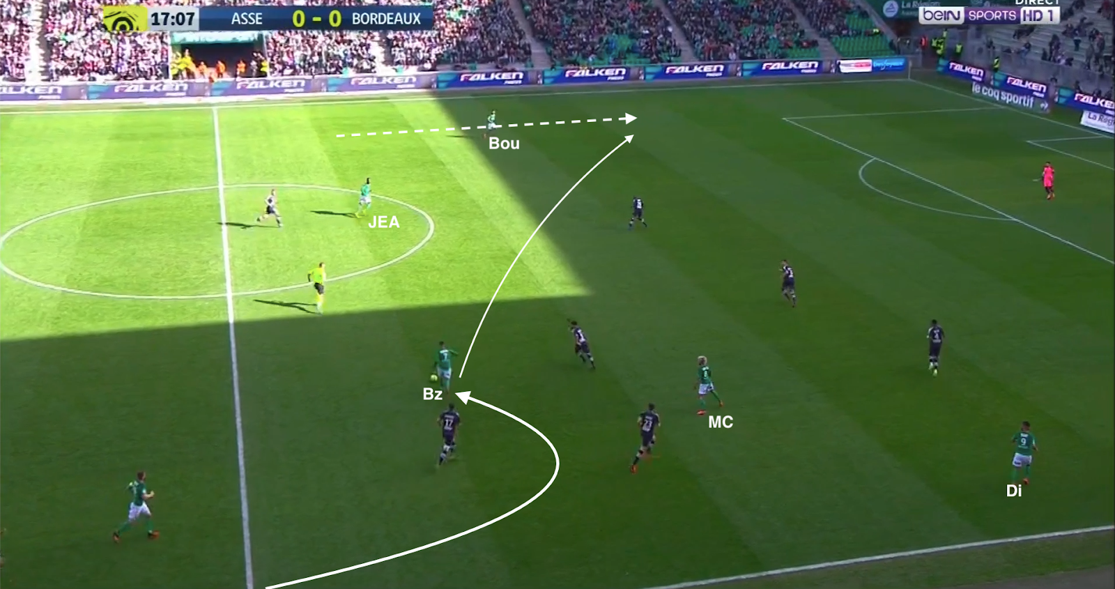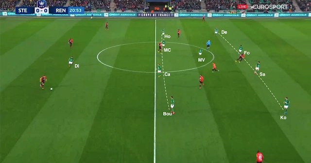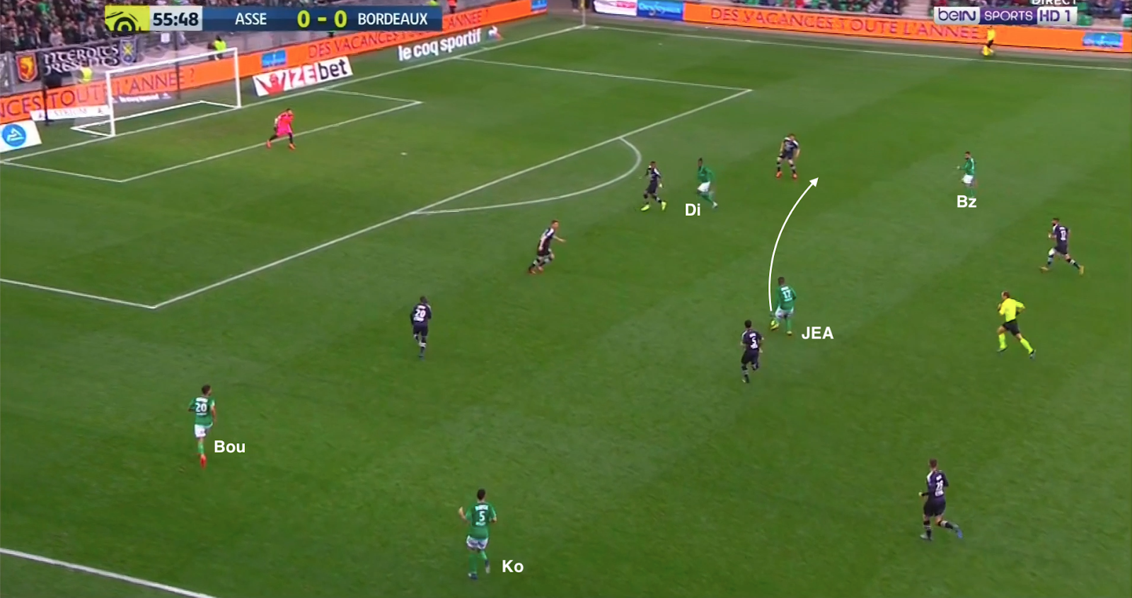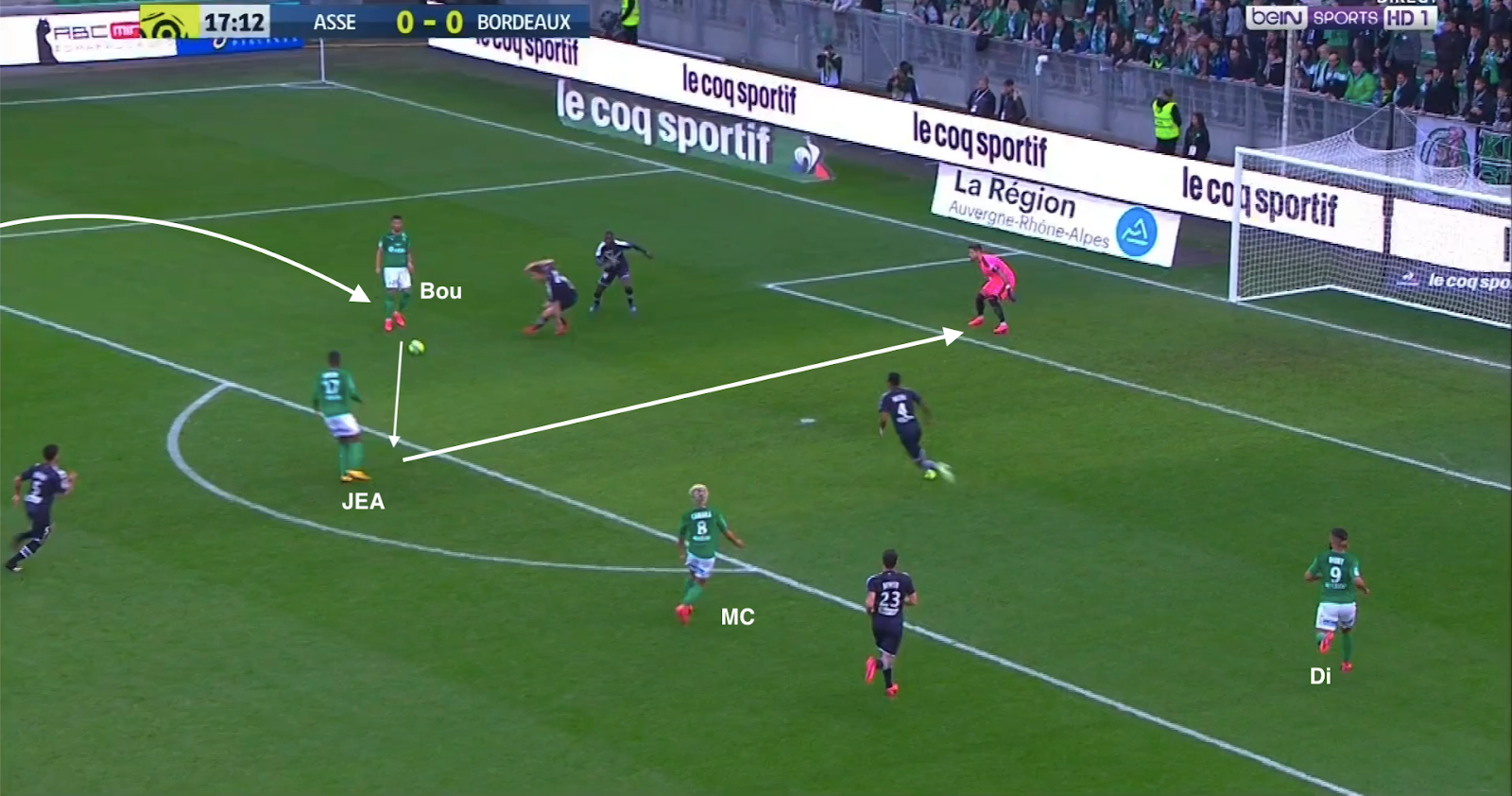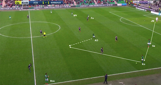 ... qui trouve Aholou avec une passe verticale. Diony et Bouanga sont de nouveaux excentrés, la défense centrale adverse n'a toujours personne à surveiller. Le milieu relayeur stéphanois ne relaye pas le ballon, mais monte avec, profitant du fait que la défense recule suite à l' appel de Diony :