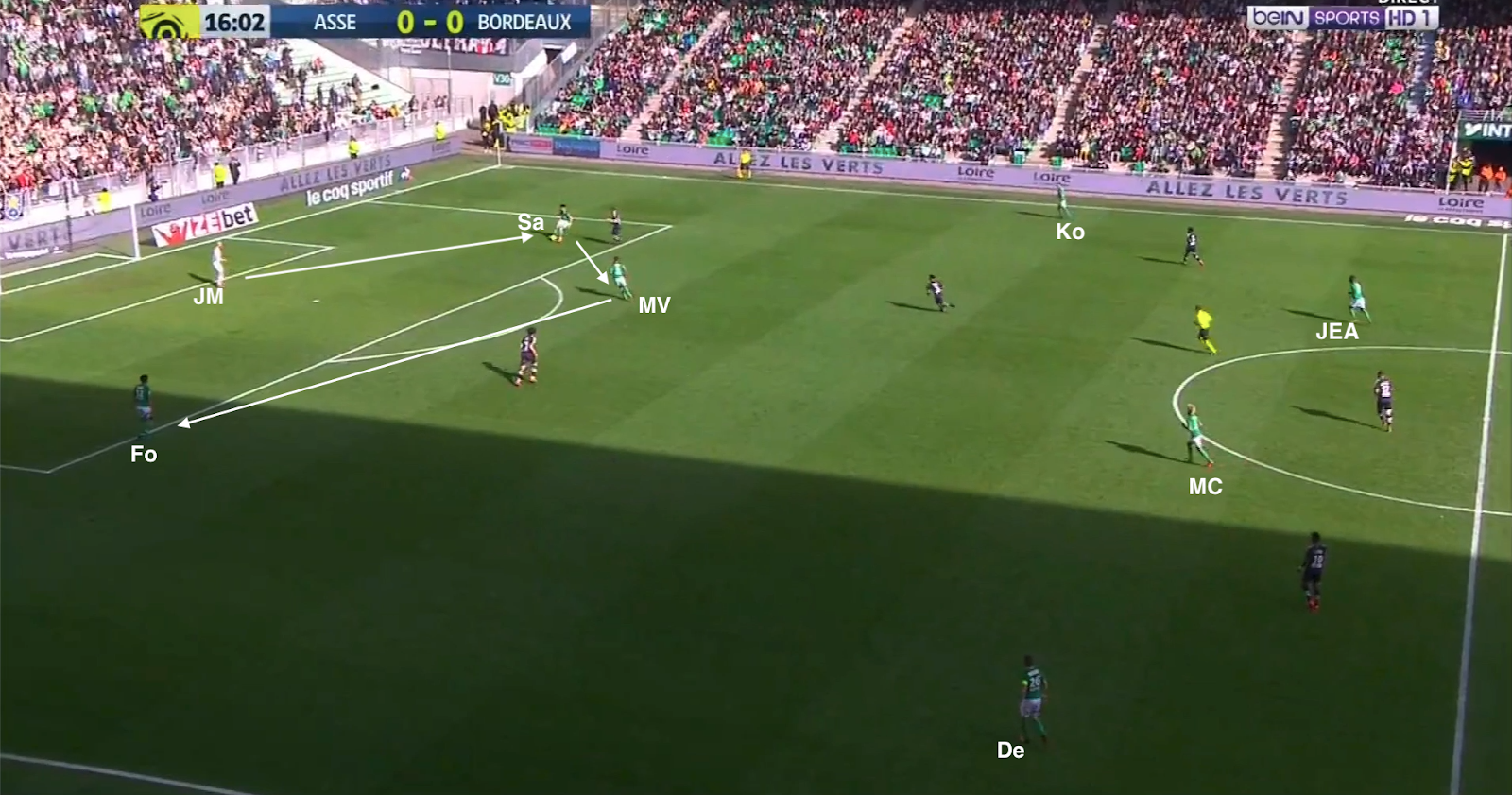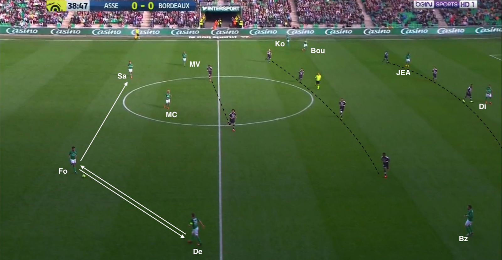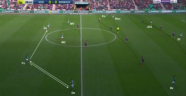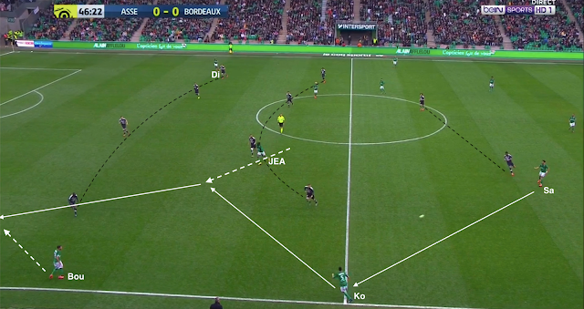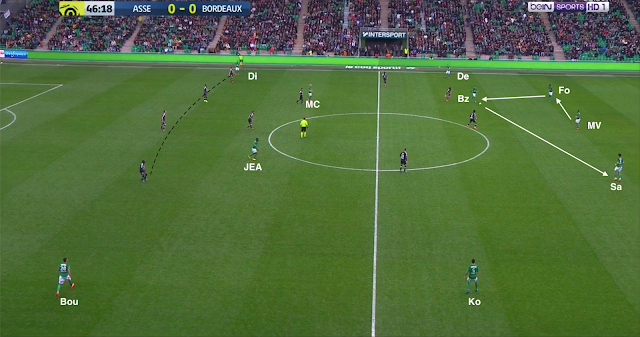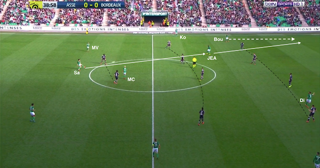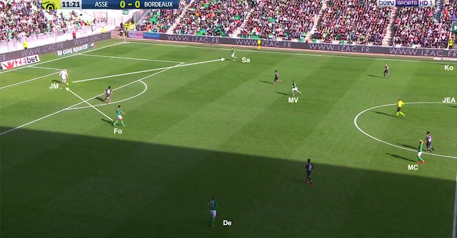 Le 4-3-3 est un système tactique très classique et une des clés dans son animation est le milieu relayeur. Voici quelques exemples du rôle de ces milieux dans le match des Verts contre Bordeaux.