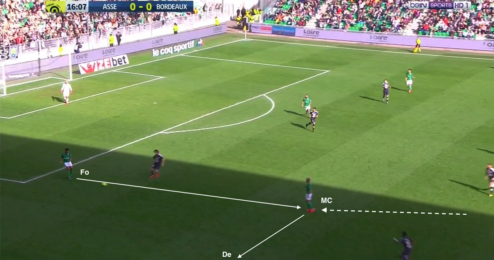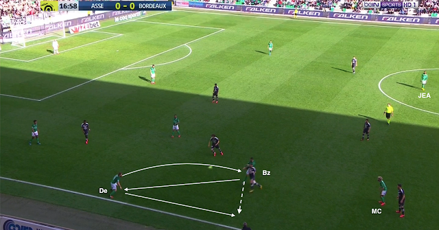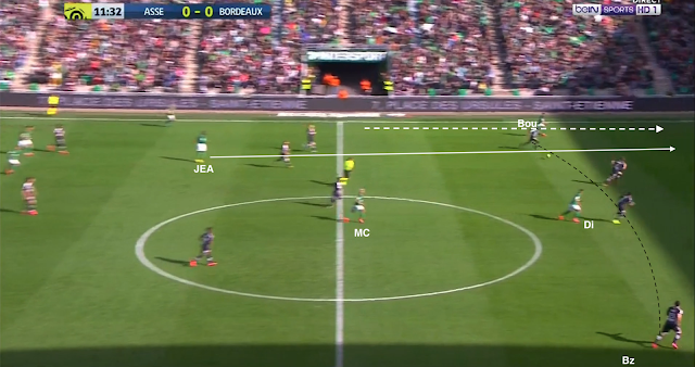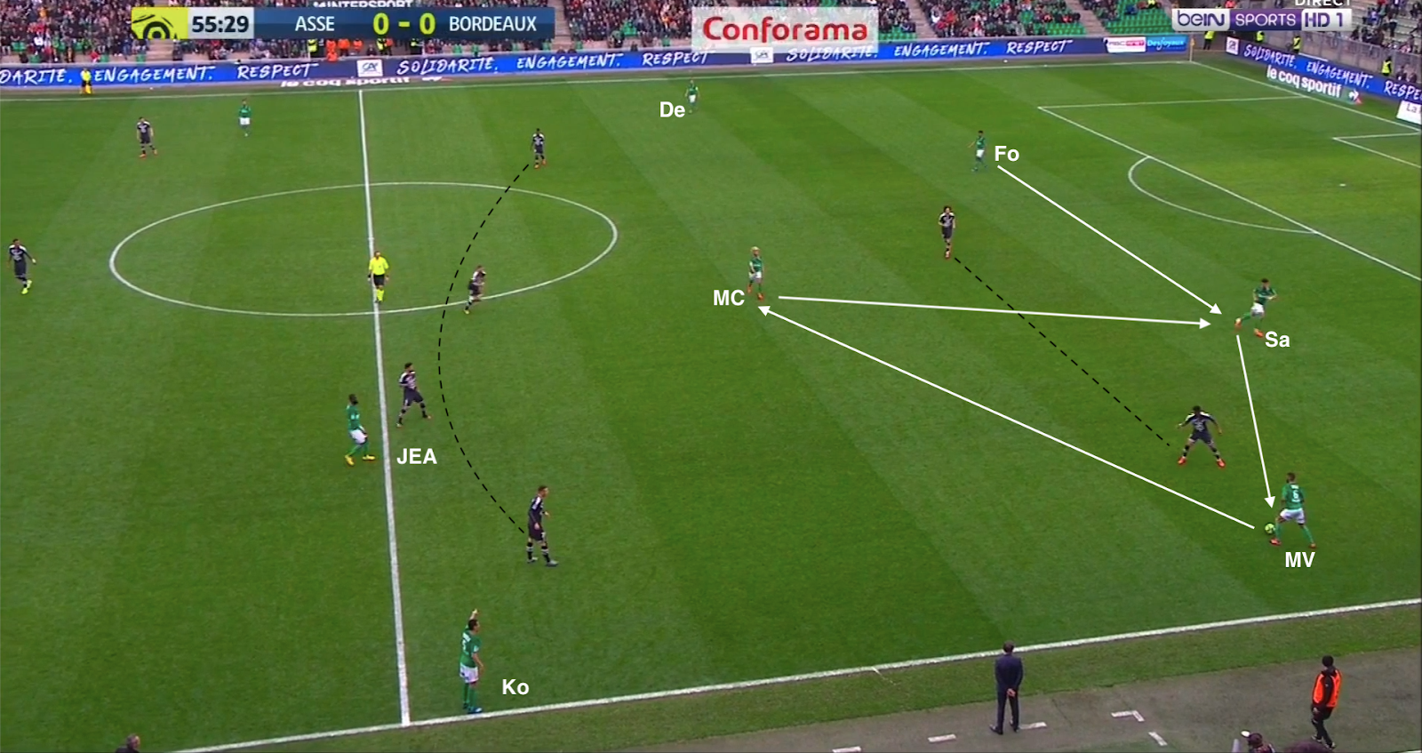 Le 4-3-3 est un système tactique très classique et une des clés dans son animation est le milieu relayeur. Voici quelques exemples du rôle de ces milieux dans le match des Verts contre Bordeaux.