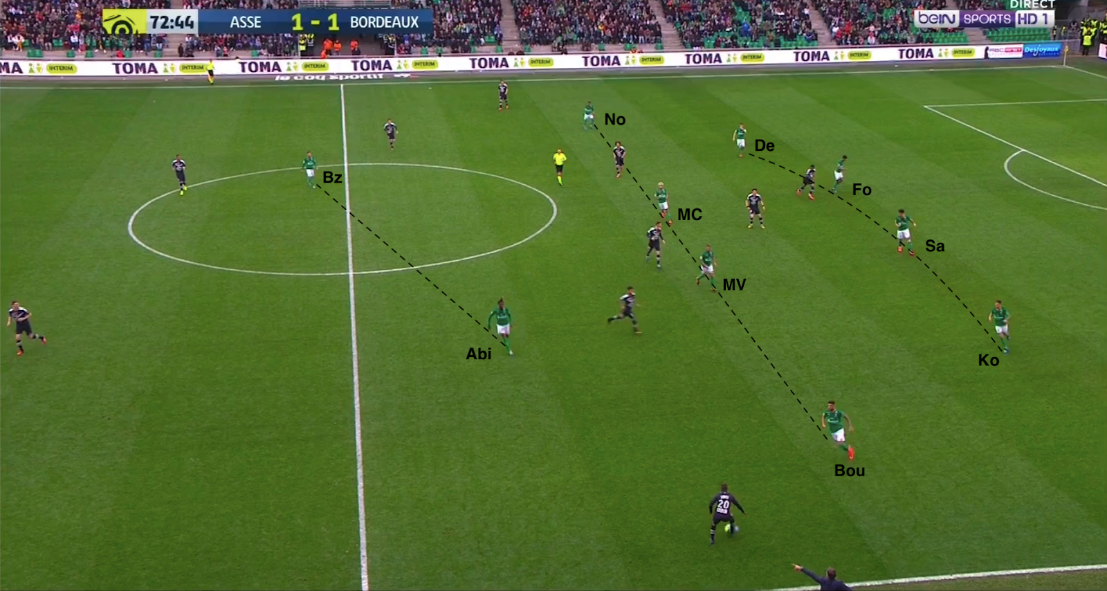 Même à 10, avec seulement deux milieux axiaux, les remontées du ballon stéphanoises sont passées par cette présence entre les lignes qui a le but de relayer le ballon vers les attaquants. Par exemple, à la 84e minute, Moulin envoie le ballon à gauche :
