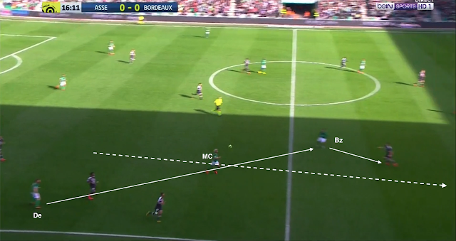 Debuchy joue avec Boudebouz, qui essaye de lancer Camara en profondeur à droite. Malheureusement, sa passe est interceptée. Dans cet exemple, Camara a participé à la construction avant de prendre la place d'un ailier.