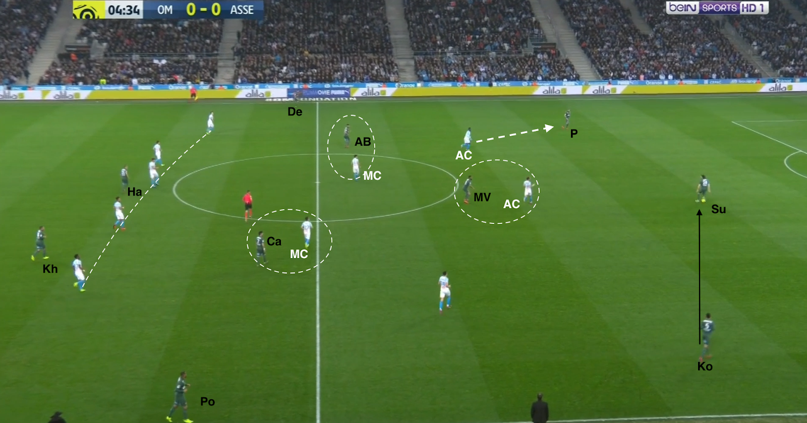 Le 5-2-3 stéphanois est bien visible, tout comme l'utilité d'une défense à 5 : les Marseillais attaquent en 4-2-4. Polomat sort de l'alignement pour bloquer le couloir, Kolo coulisse pour couvrir dans son dos et récupère le ballon qui arrive à M'Vila :