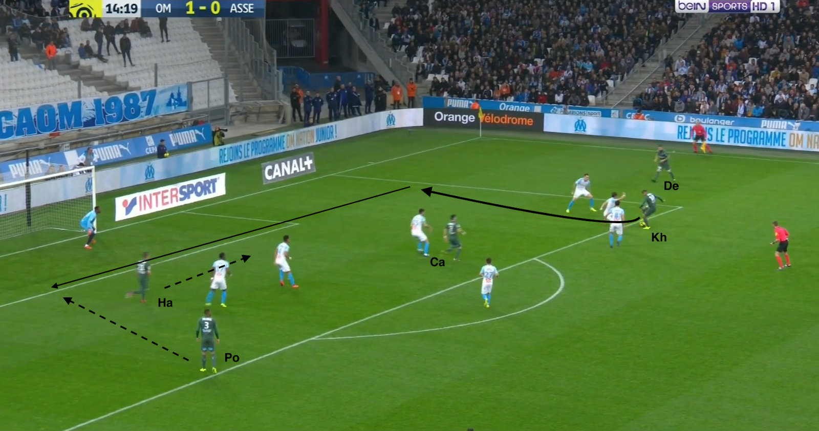 Ces phases de transition sont dangereuses, même si les Verts ne se trouvent pas en infériorité dans cette situation. Polomat et Debuchy étaient haut, mais la défense à 3 et les 2 milieux ont seulement 4 Marseillais à gérer. Et pourtant...