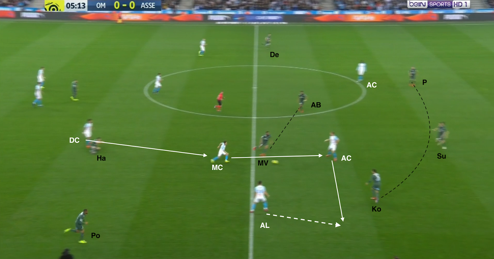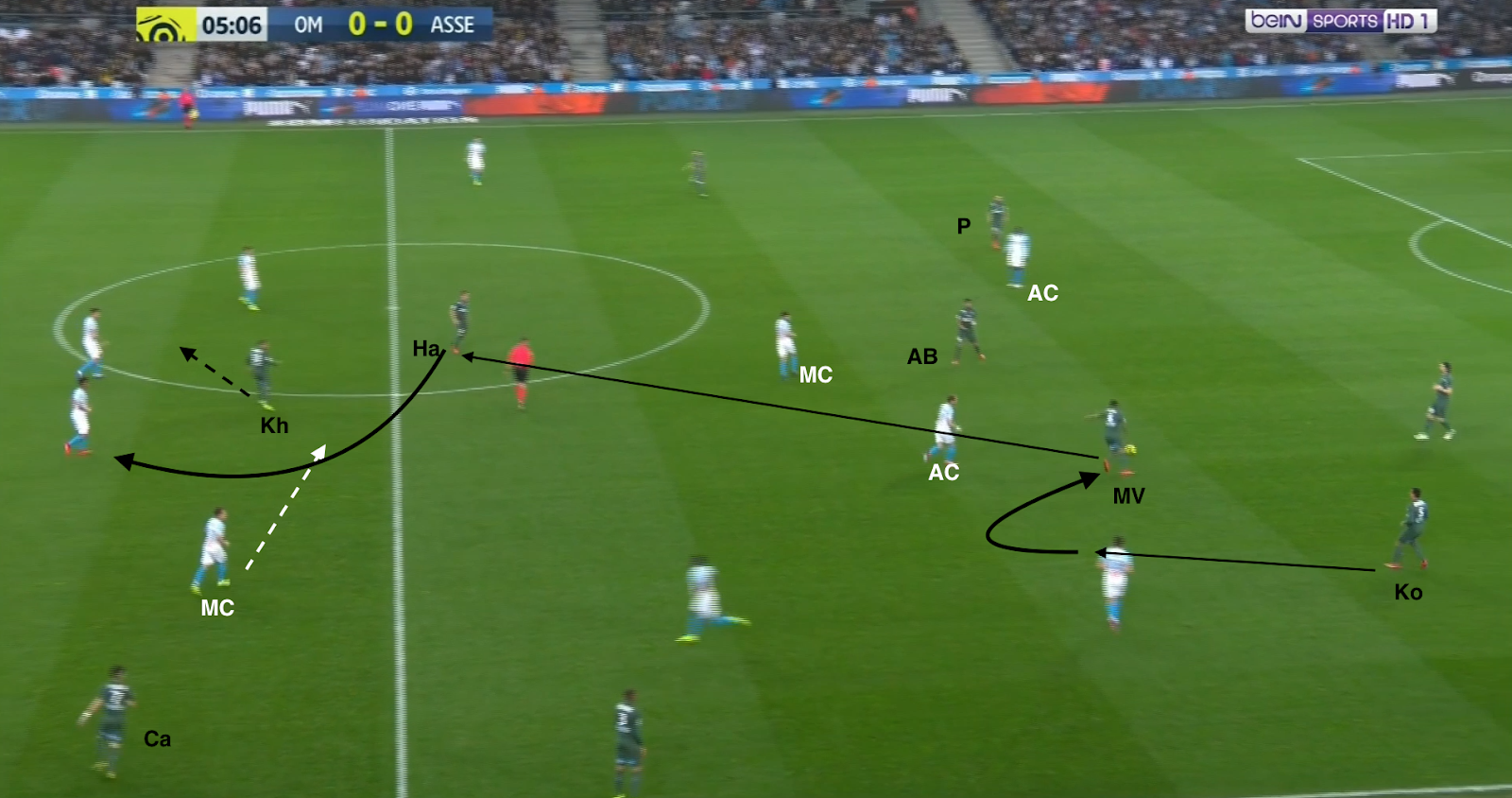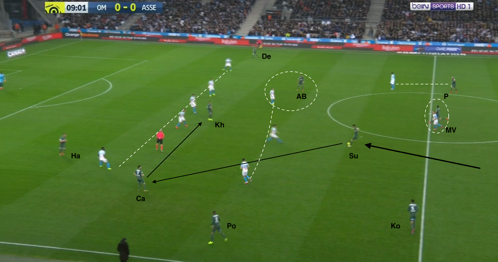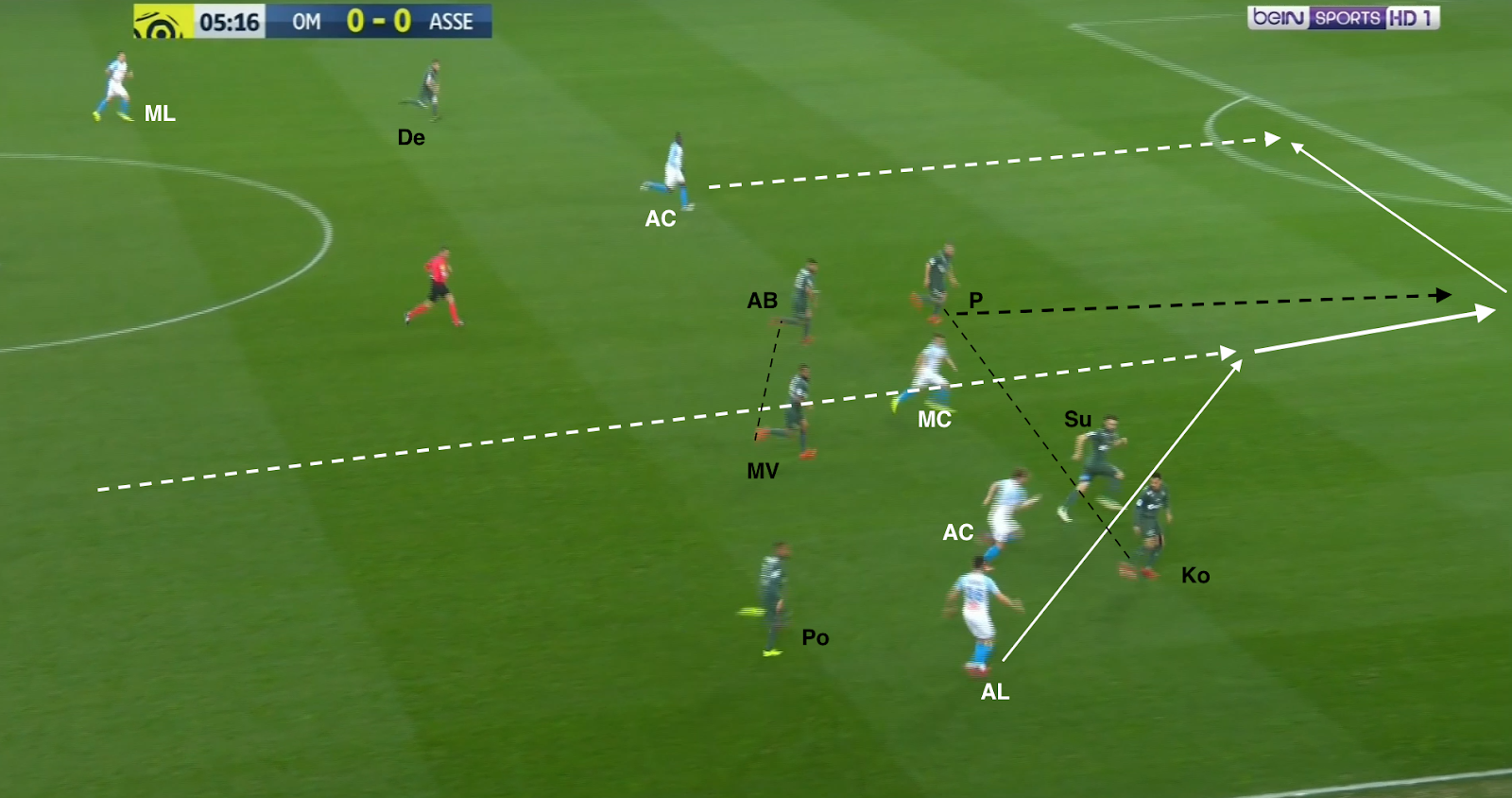 "Son" avant-centre reste à côté de Kolo pendant que l'autre est discipliné et s'en va chercher Perrin, ce qui libère un angle de passe vers Aït Bennasser. M'Vila est recherché par un milieu axial, ce qui permet aux Stéphanois de trouver Cabella et Polomat à gauche - dans deux passes les deux premières lignes du bloc marseillais ont été franchies. Cabella laisse le ballon aller vers le côté et fait un appel dans l'axe :