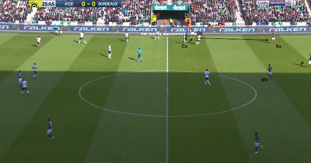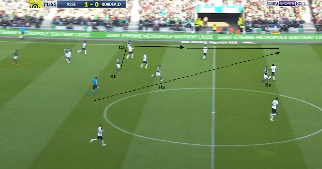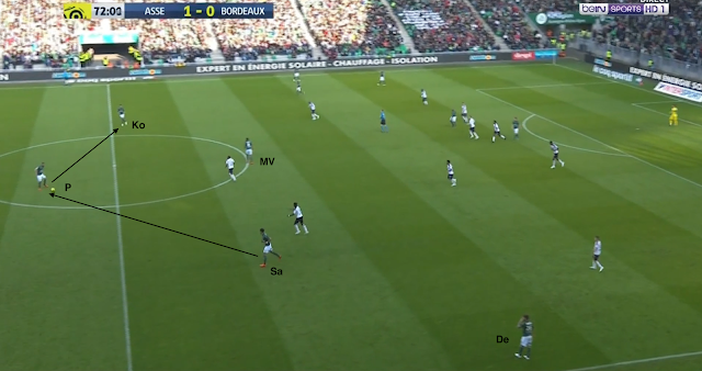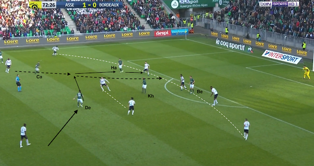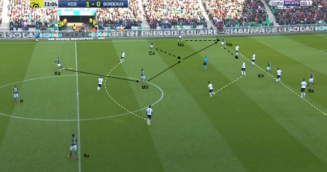Si normalement dans un système à 3 défenseurs les couloirs sont pour les pistons, deux des 3 offensifs stéphanois ont eu comme consigne de s'excentrer aussi. Ce qui a permis donc aux Verts de créer du surnombre sur les côtés, comme dans cet autre exemple à la 26e :