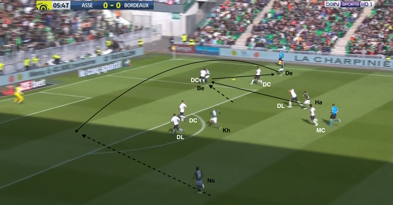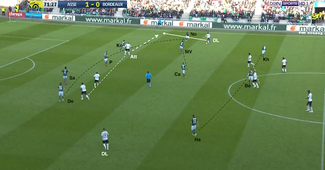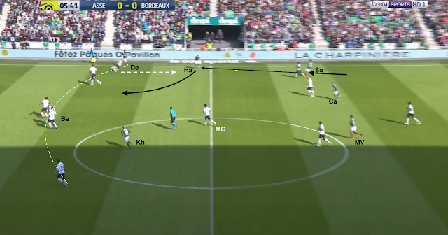 Le latéral gauche girondin monte près de son adversaire direct, Debuchy. Comme Khazri est collé à la ligne de touche aussi, toute la défense adverse coulisse vers la gauche, ce qui laisse Hamouma et Nordin seuls de l'autre côté. Saliba et M'Vila gardent leur calme malgré le pressing adverse...