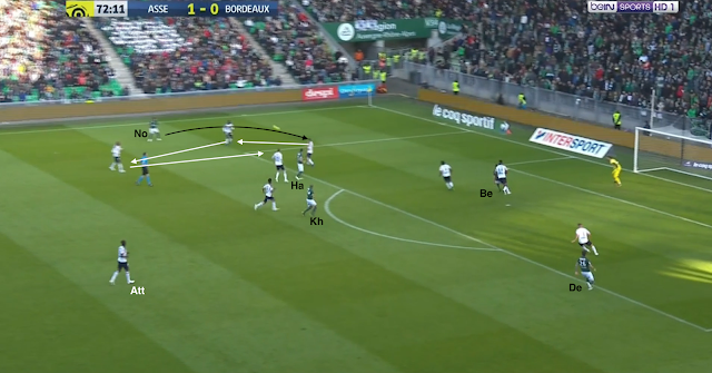 Bordeaux a la possession et construit une attaque à droite. Le bloc 5-2-3 stéphanois est en place, Nordin sort sur son adversaire direct, un des trois attaquants reçoit le ballon dans son dos. Il est bien enfermé sur ce côté, mais il arrive à passer le ballon à un coéquipier...
