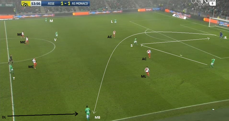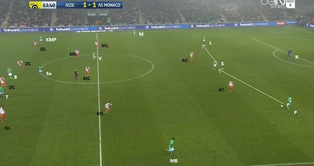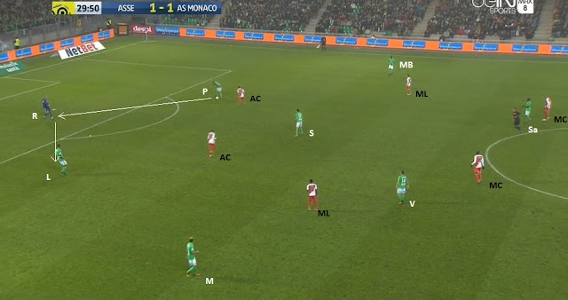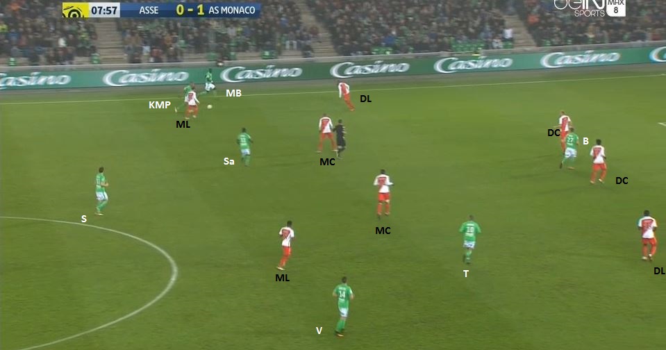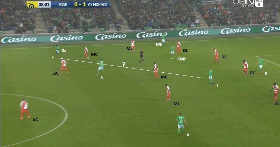 Comme les Monégasques défendent avec deux lignes de 4, sans sentinelle, il y a un espace entre les lignes. Les Verts jouent sans un "10" traditionnel, mais il était dommage de ne pas profiter de cet espace. Si en seconde période c'est Saivet qui l'a plutôt occupé (notre équipe ressemblant plus à un 4-2-3-1), en première mi-temps c'est notre faux milieu excentré Tannane qui l'a fait, comme dans cet exemple pris à la 8ème.