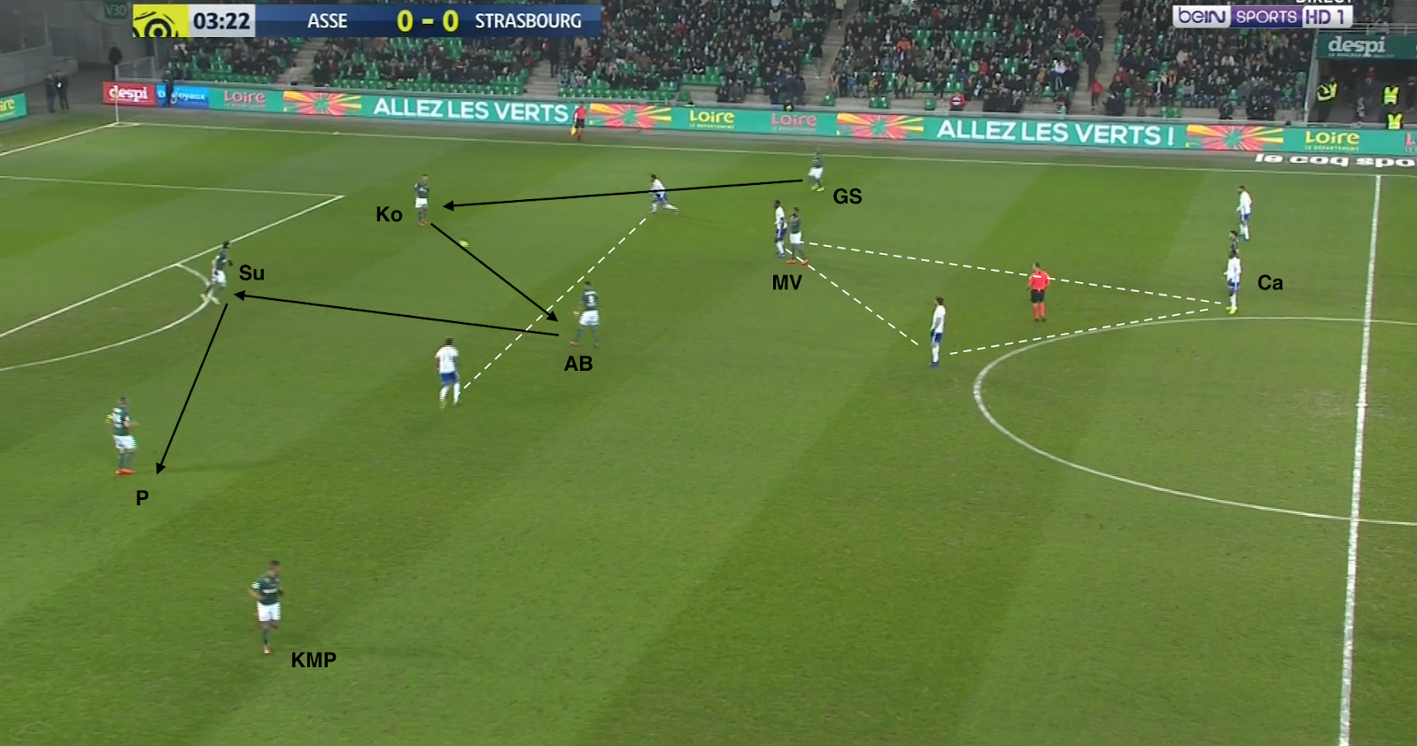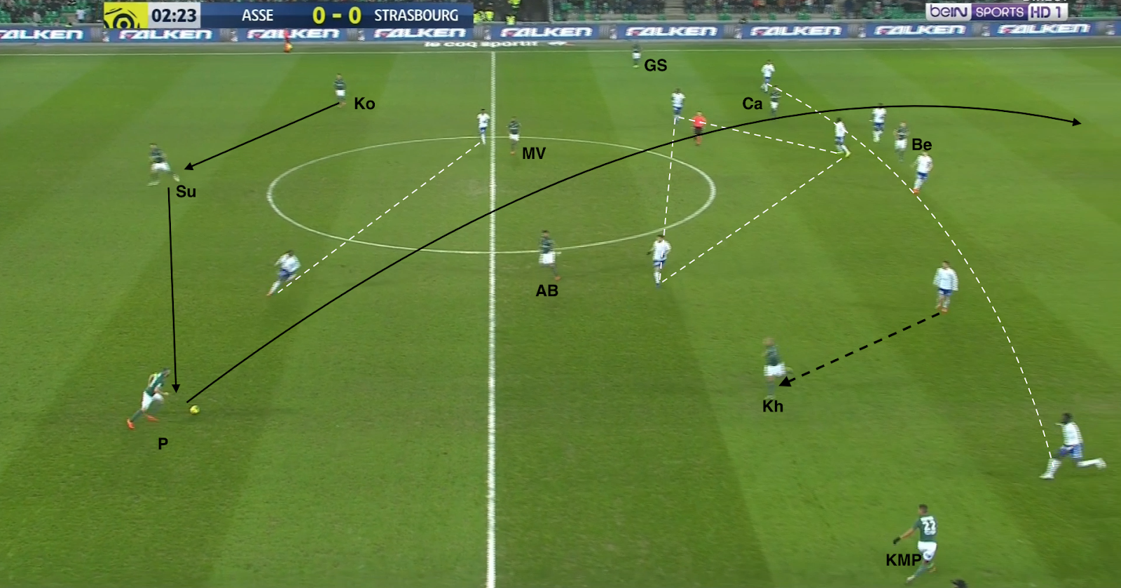 Les défenseurs de l'ASSE se passent le ballon, de Kolo vers Perrin via Subotic. Les pistons dans les couloirs, M'Vila et Aït Bennasser au centre, Cabella, Beric et Khazri dans la défense. Le dernier décroche pour offrir une solution de passe au capitaine mais celui-ci préfère un long ballon en profondeur à destination de Beric. Un défenseur adverse le récupère facilement...