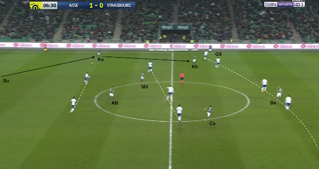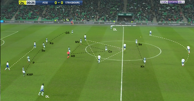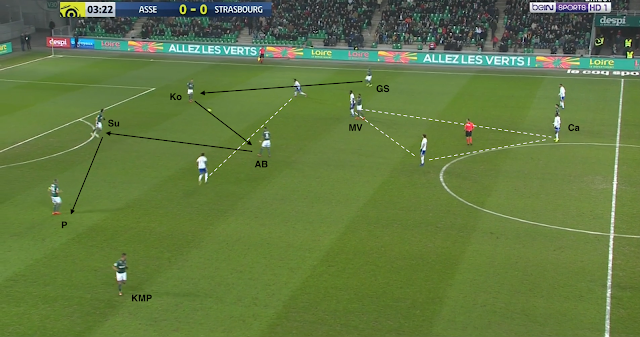 Qu'ont donc tous ces exemples en commun ? Un bloc strasbourgeois bien en place avec une forte densité dans l'axe. Une équipe stéphanoise avec trois éléments offensifs dont un fixe dans la défense et deux autres très mobiles qui se déplacent un peu partout sur le terrain. Partout sauf dans l'axe - plutôt sur les côtés donc, amenant du surnombre et créant ainsi des décalages. Et des mouvements clairement répétés à l'entraînement, puisque si récurrents : Khazri qui décroche et Cabella qui plonge dans l'espace, surnombre sur le côté droit et passe en profondeur de Subotic pour KMP, etc. Mais surtout, une grande maîtrise technique, des déplacements, de la volonté de produire du jeu. Bref, du beau football.