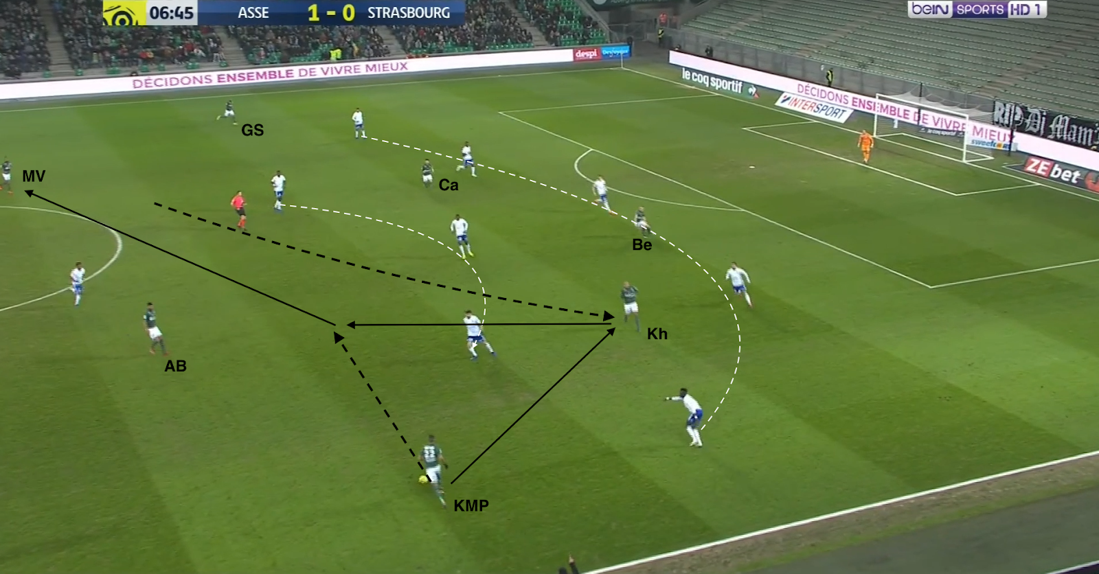 ... et ils combinent ensuite avec M'Vila et Aït Bennasser. Le triangle des milieux adverses est toujours en place mais il n'y a toujours aucun stéphanois dans l'axe entre les lignes : Khazri est à côté de Gabriel Silva et Cabella vers KMP. Le premier décroche, comme dans l'exemple précédent, et il est servi par Kolo :