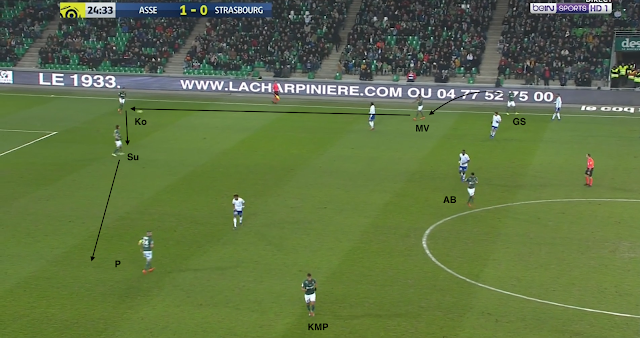 ... ce qui déclenche le mouvement des deux milieux axiaux stéphanois vers ce côté. Un seul milieu adverse a suivi, les deux autres restant l'un à côté de l'autre dans l'axe, et ne servant en fait à rien. A 4 contre 3 sur ce côté, les Verts combinent : Khazri redonne à KMP et repique vers l'axe...