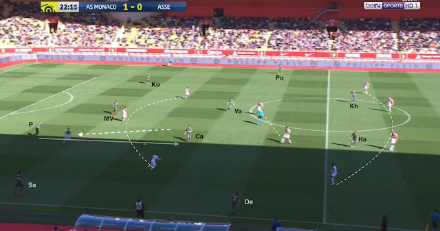 La défense à trois est visible (enfin, difficilement à cause de la partie à l'ombre et la couleur des maillots stéphanois), tout comme l'étau des quatre offensifs monégasques autours des deux milieux axiaux M'Vila et Vada. Saliba joue avec Perrin, qui échange des passes...