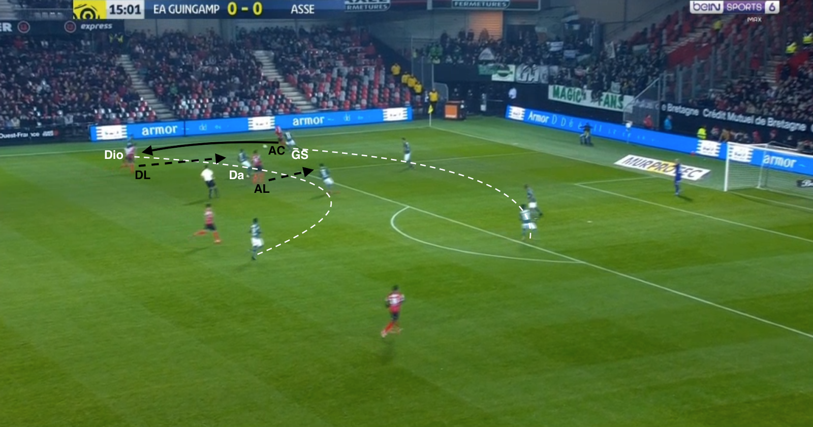 A la 15e, après une faute de Söderlund sur le même milieu central qu'il a essayé de casser quelques minutes plus tard, Guingamp bénéficie d'un coup franc dans sa propre moitié, joué dans le couloir gauche :