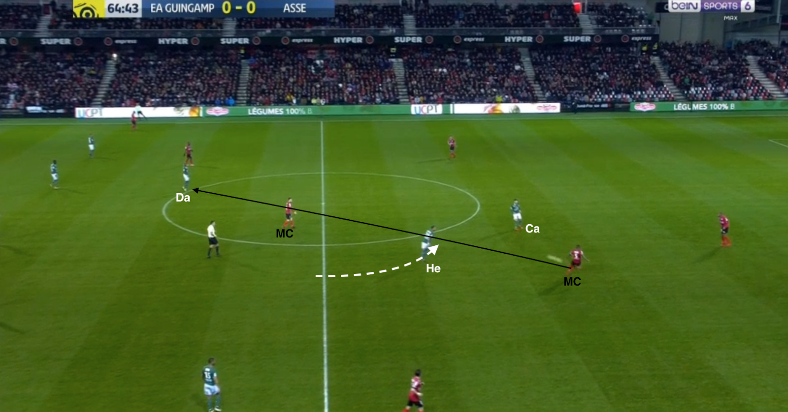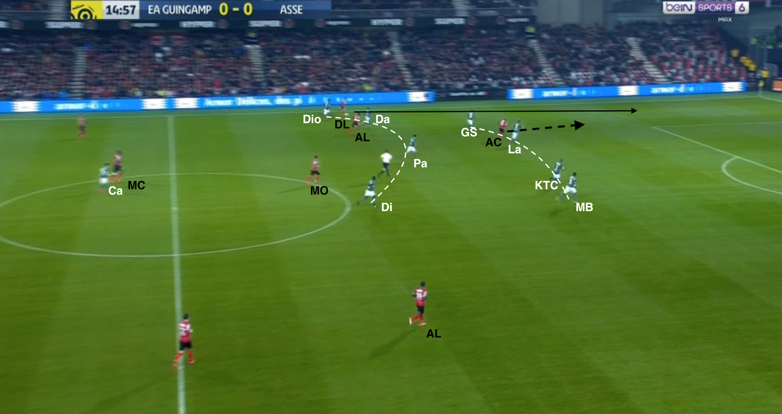 Sur cette image on peut observer que Diony défend dans le couloir droit, mais Cabella ne se trouve pas à gauche, il marque un milieu central - l'ASSE défend dans un 4-4-1-1. Le latéral gauche adverse lance son avant-centre en profondeur, mais il est bien suivi par la défense, largement en surnombre.