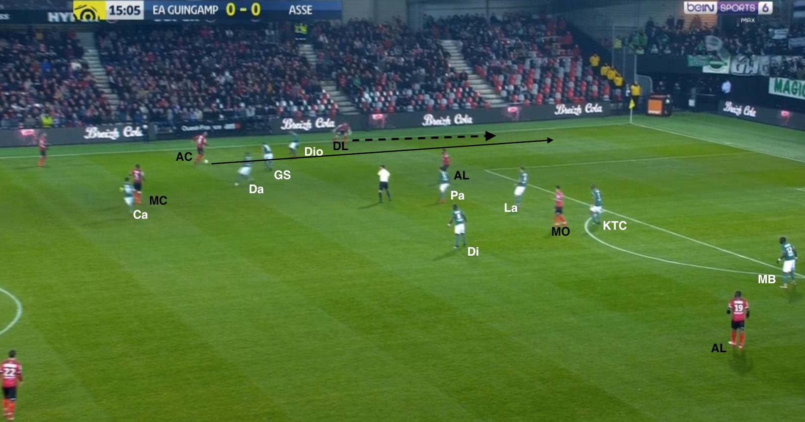 Sur cette image on peut observer que Diony défend dans le couloir droit, mais Cabella ne se trouve pas à gauche, il marque un milieu central - l'ASSE défend dans un 4-4-1-1. Le latéral gauche adverse lance son avant-centre en profondeur, mais il est bien suivi par la défense, largement en surnombre.
