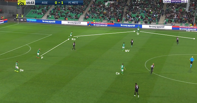 Quelques minutes plus tard, le 5-2-3 (3-4-3 défensif) des Verts est visible sur une attaque messine, le ballon dans le rond central. La ligne de 3 offensifs ne sert à rien : pas de pressing et surtout les angles de passes ne sont pas coupés. Un milieu adverse peut être ainsi facilement trouvé dans l'entre-jeu et les seuls deux milieux centraux sur cette ligne ont du mal à couvrir toute la largeur. Pire, Kolo se jette pour le prendre...