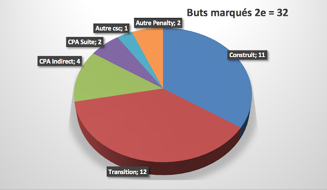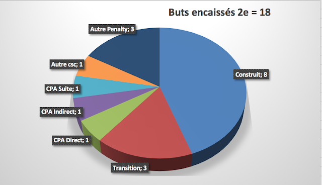 Il n'y a rien à dire, la différence défensive entre les deux périodes de la saison est énorme, quasiment deux fois plus de buts encaissés lors de la première. La proportion des buts pris dans le jeu a baissé un peu après Noël, mais pas significativement. Par contre, si les buts qui ont suivi une action construite par l'adversaire ont le même poids, l'ASSE a encaissé une proportion plus faible des buts suite à ses pertes de balle - la maîtrise technique a été d'un autre niveau à partir de janvier.