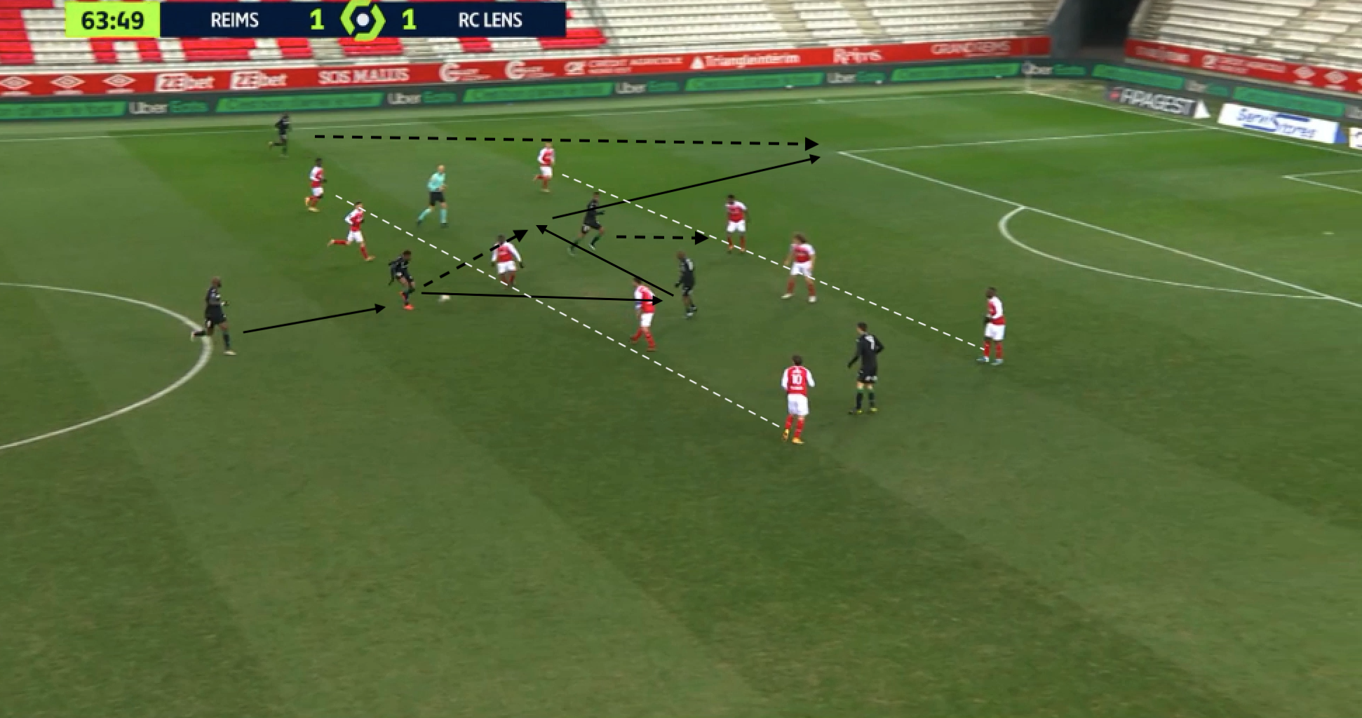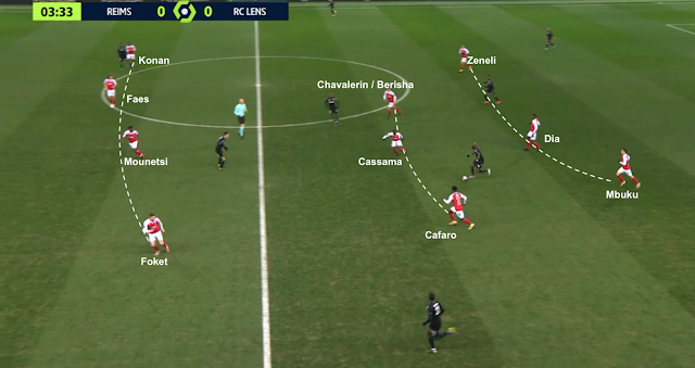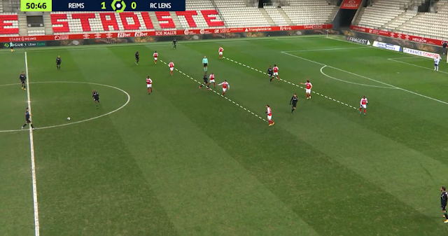 Bloc en 4-5-1 pour Reims et attaque plein centre pour Lens, qui profite que l'avant-centre adverse n'est pas revenu pour empêcher ce genre d'action. Malgré les deux lignes très resserrées, la maîtrise lensoise leur permet de combiner dans le bloc et de passer le premier rideau. Ce qui casse tout le système défensif, les Rémois se désorganisant complètement :