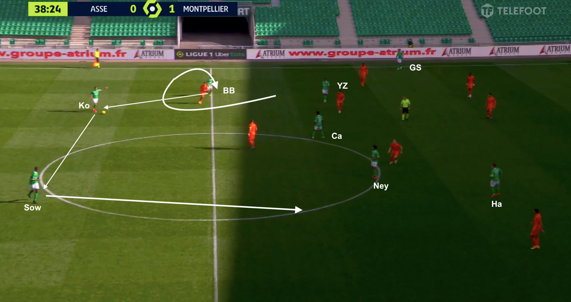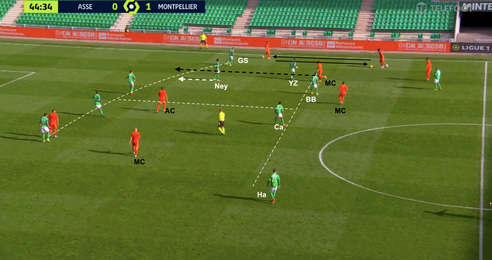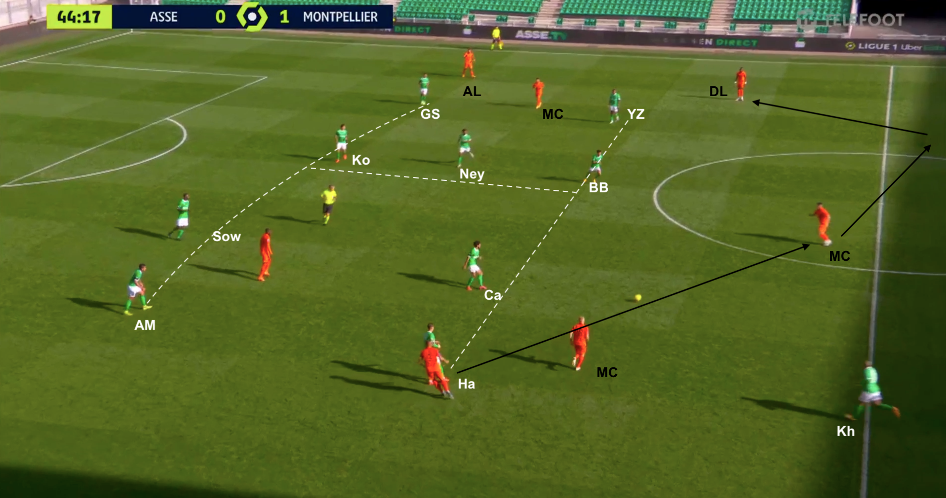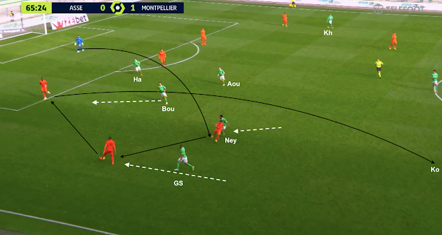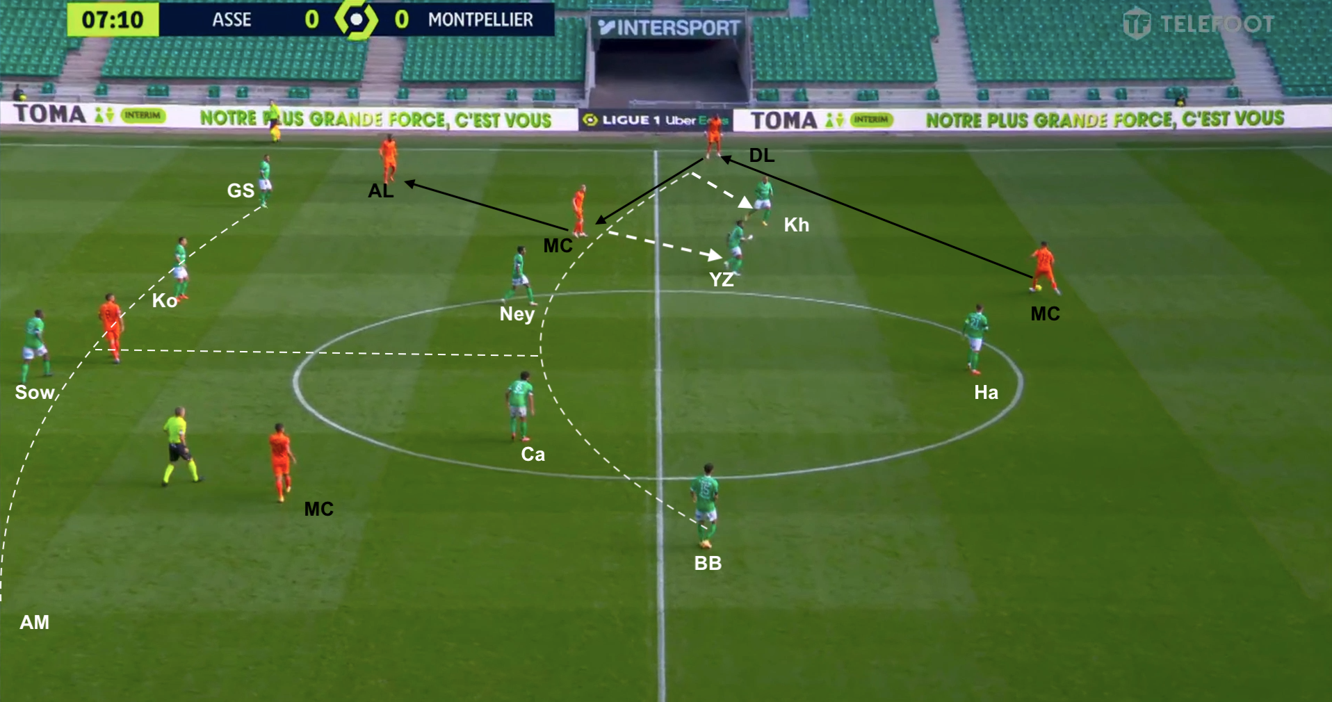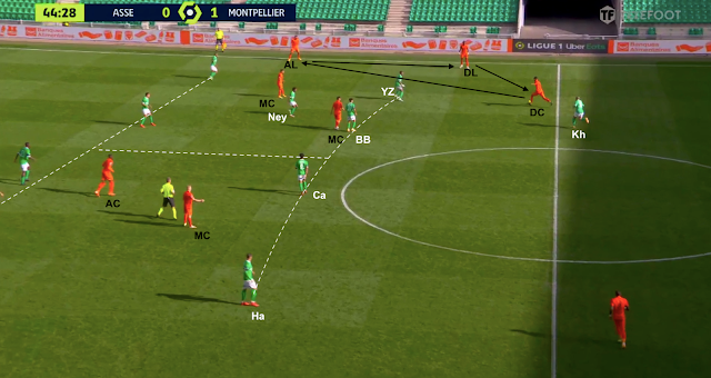 Les Montpelliérains échangent des passes dans le couloir, pendant que leurs milieux essayent de se placer entre les lignes - Neyou se trouve au marquage de celui proche de l'action. Il n'y a aucune pression sur le porteur du ballon (à l'exception de Silva sur l'ailier à un moment donné), les Verts regardent leurs adversaires se faire des passes dans le couloir :