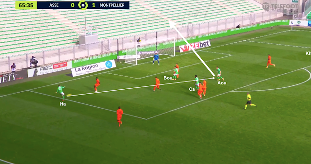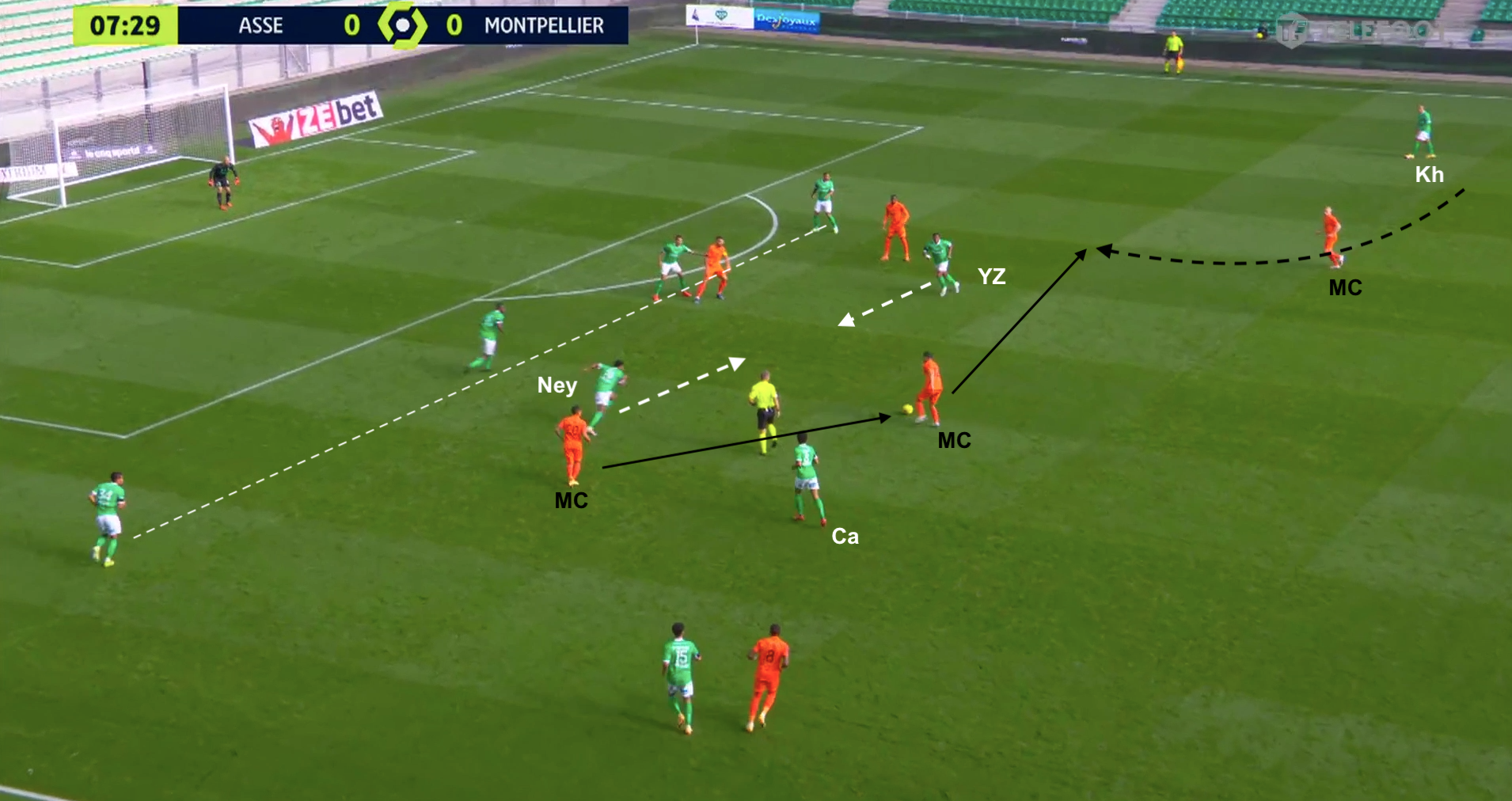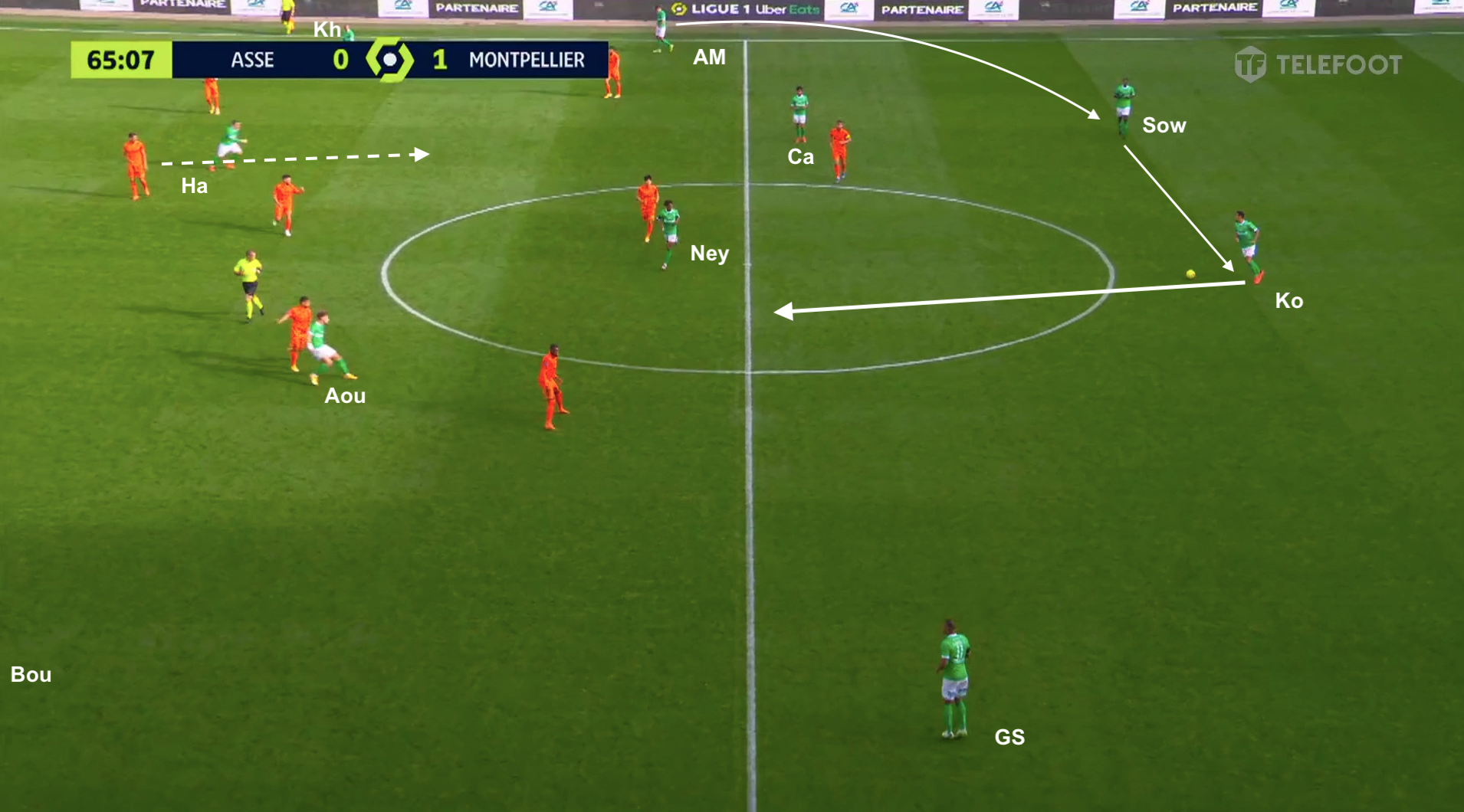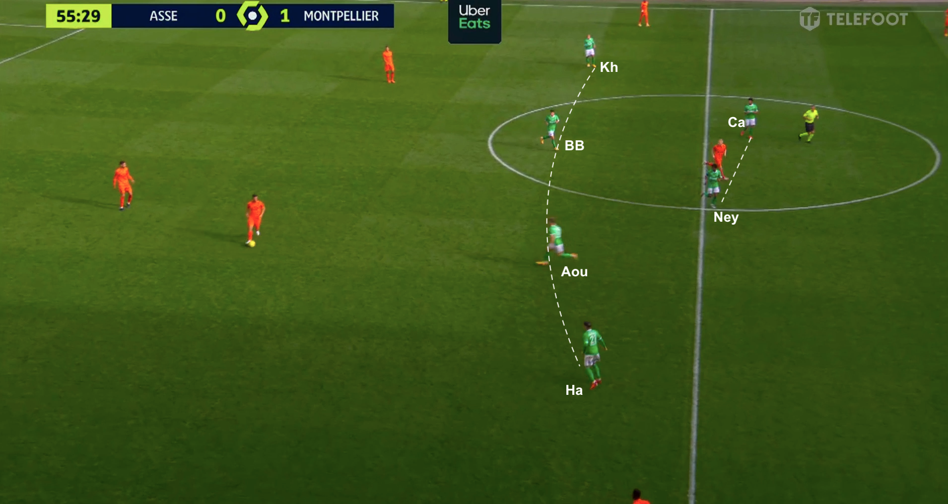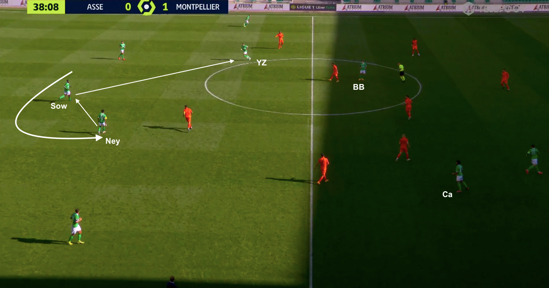 Les Montpelliérains échangent des passes dans le couloir, pendant que leurs milieux essayent de se placer entre les lignes - Neyou se trouve au marquage de celui proche de l'action. Il n'y a aucune pression sur le porteur du ballon (à l'exception de Silva sur l'ailier à un moment donné), les Verts regardent leurs adversaires se faire des passes dans le couloir :