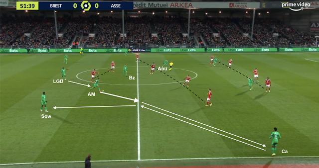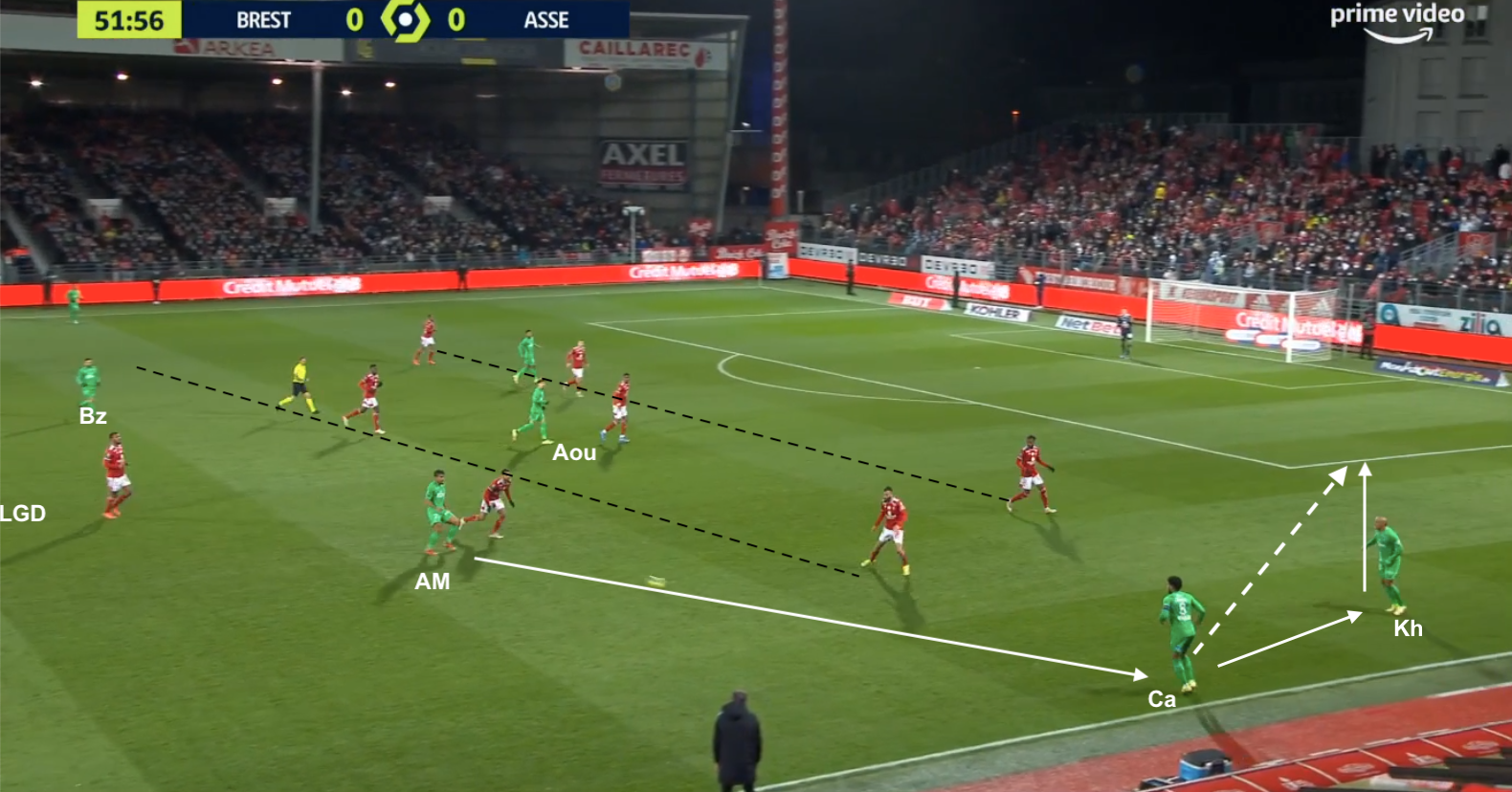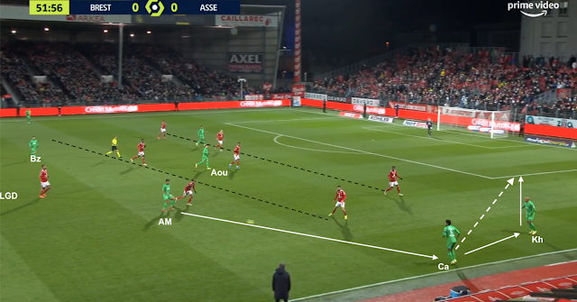 Un système 4-4-2 à plat, avec un couloir droit inhabituel, Camara en latéral et Moueffek en milieu excentré. Aouchiche a été le milieu excentré gauche, Bouanga étant aligné à côté de Khazri en pointe. Si le choix de Boudebouz en milieu défensif / premier relanceur n'est plus une surprise, l'utilisation de deux milieux de profil axial dans les couloirs était une option nouvelle. Et pour mieux comprendre pourquoi, voici le positionnement des Verts avec le ballon en 1MT :