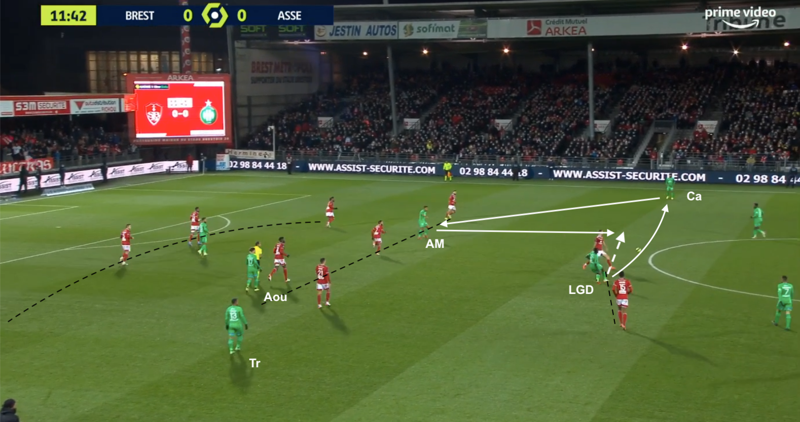 Pendant une heure de jeu, les Verts ont eu 61% de possession, mais sans se créer de vraies occasions. Et pendant cette période, dans le jeu, le rapport de tirs a été de 3 à 1 en faveur du Stade Brestois. Un parfait exemple de possession stérile.