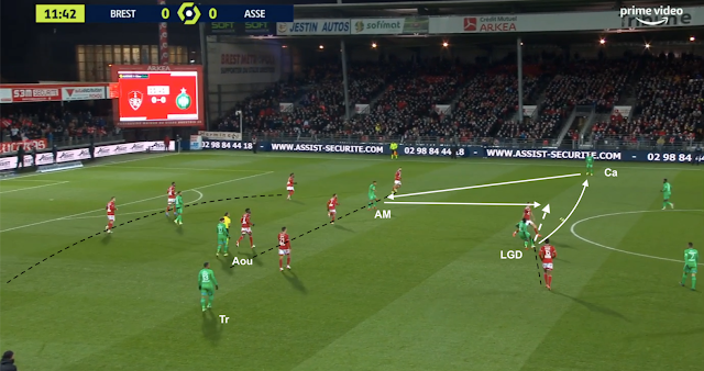 ... et Gourna. Sur cette image on voit mieux le "losange" au milieu. C'est Boudebouz qui est le plus surveillé par les Brestois, donc Moueffek a plus d'espace. Il est trouvé et il relaye de nouveau le ballon...